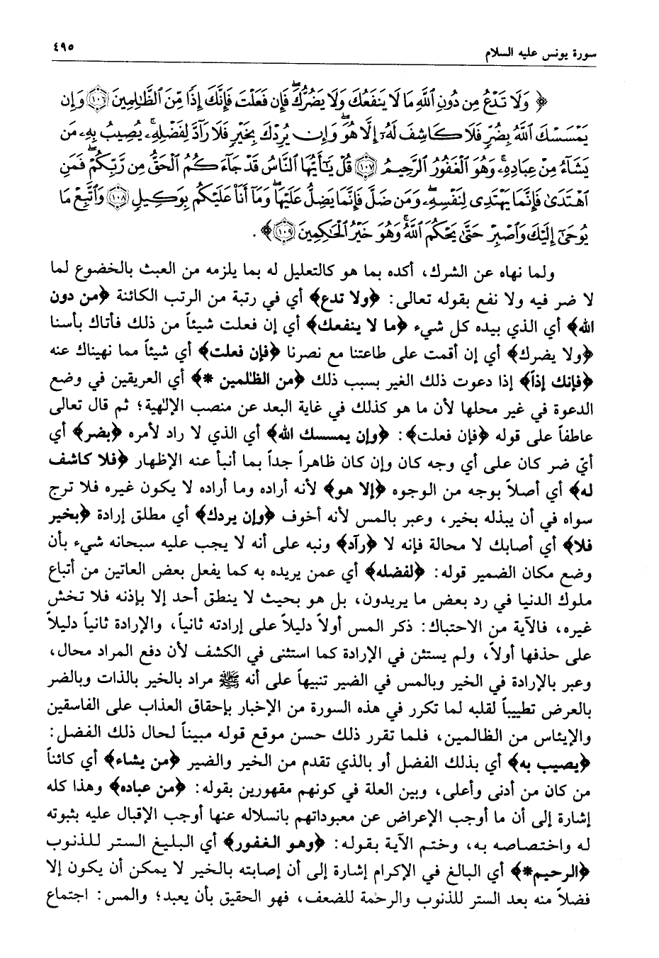 ) وَلاَ تَدْعُ مِن دُونِ اللَّهِ مَا لاَ يَنفَعُكَ وَلاَ يَضُرُّكَ فَإِن فَعَلْتَ فَإِنَّكَ إِذاً مِّنَ الظَّالِمِينَ وَإِن يَمْسَسْكَ اللَّهُ بِضُرٍّ فَلاَ كَاشِفَ لَهُ إِلاَّ هُوَ وَإِن يُرِدْكَ بِخَيْرٍ فَلاَ رَآدَّ لِفَضْلِهِ يُصَيبُ بِهِ مَن يَشَآءُ مِنْ عِبَادِهِ وَهُوَ الْغَفُورُ الرَّحِيمُ قُلْ يأَيُّهَا النَّاسُ قَدْ جَآءَكُمُ الْحَقُّ مِن رَّبِّكُمْ فَمَنُ اهْتَدَى فَإِنَّمَا يَهْتَدِي لِنَفْسِهِ وَمَن ضَلَّ فَإِنَّمَا يَضِلُّ عَلَيْهَا وَمَآ أَنَاْ عَلَيْكُمْ بِوَكِيلٍ وَاتَّبِعْ مَا يُوحَى إِلَيْكَ وَاصْبِرْ حَتَّى يَحْكُمَ اللَّهُ وَهُوَ خَيْرُ الْحَاكِمِينَ ( ( )