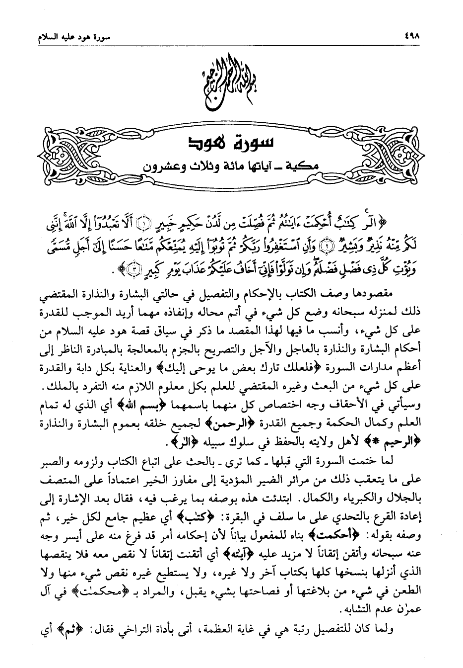 ) الر كِتَابٌ أُحْكِمَتْ آيَاتُهُ ثُمَّ فُصِّلَتْ مِن لَّدُنْ حَكِيمٍ خَبِيرٍ أَلاَّ تَعْبُدُواْ إِلاَّ اللَّهَ إِنَّنِي لَكُمْ مِّنْهُ نَذِيرٌ وَبَشِيرٌ وَأَنِ اسْتَغْفِرُواْ رَبَّكُمْ ثُمَّ تُوبُواْ إِلَيْهِ يُمَتِّعْكُمْ مَّتَاعاً حَسَناً إِلَى أَجَلٍ مُّسَمًّى وَيُؤْتِ كُلَّ ذِي فَضْلٍ فَضْلَهُ وَإِن تَوَلَّوْاْ فَإِنِّي أَخَافُ عَلَيْكُمْ عَذَابَ يَوْمٍ كَبِيرٍ ( ( )