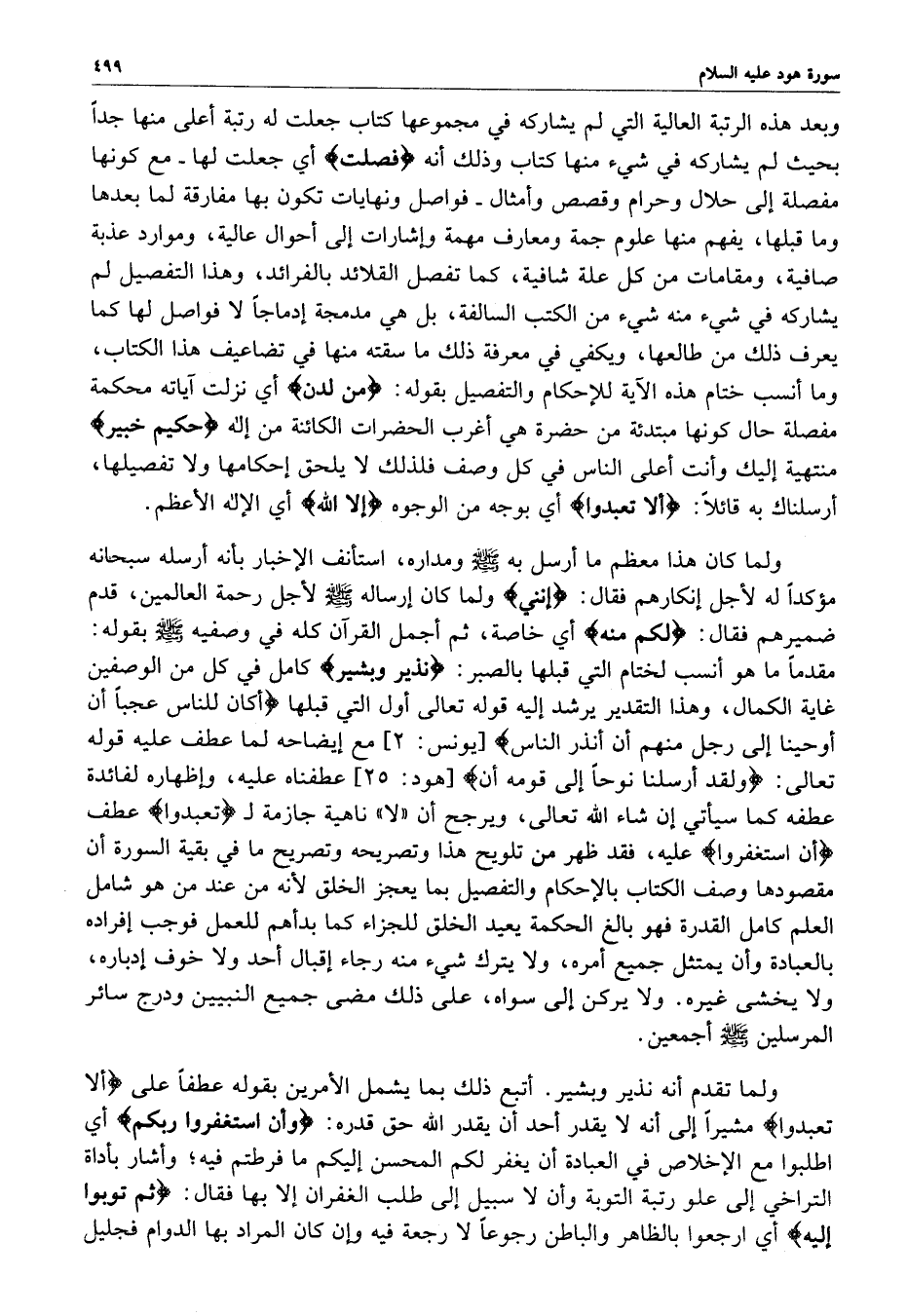 [ هود : 25 ] عطفناه عليه ، وإظهاره لفائدة عطفه كما سيأتي إن شاء الله تعالى ، ويرجح أن ( لا ) ناهية جازمة ل ) تعبدوا ( عطف ) أن استغفروا ( عليه ، فقد ظهر من تلويح هذا وتصريحه وتصريح ما في بقية السورة أن مقصودها وصف الكتاب بالإحكام والتفصيل بما يعجز كما بدأهم للعمل فوجب إفراده بالعبادة وأن يمتثل جميع أمره ، ولا يترك شيء منه رجاء غقبال أحد ولا خوف إدباره ، ولا يخشى غيره .