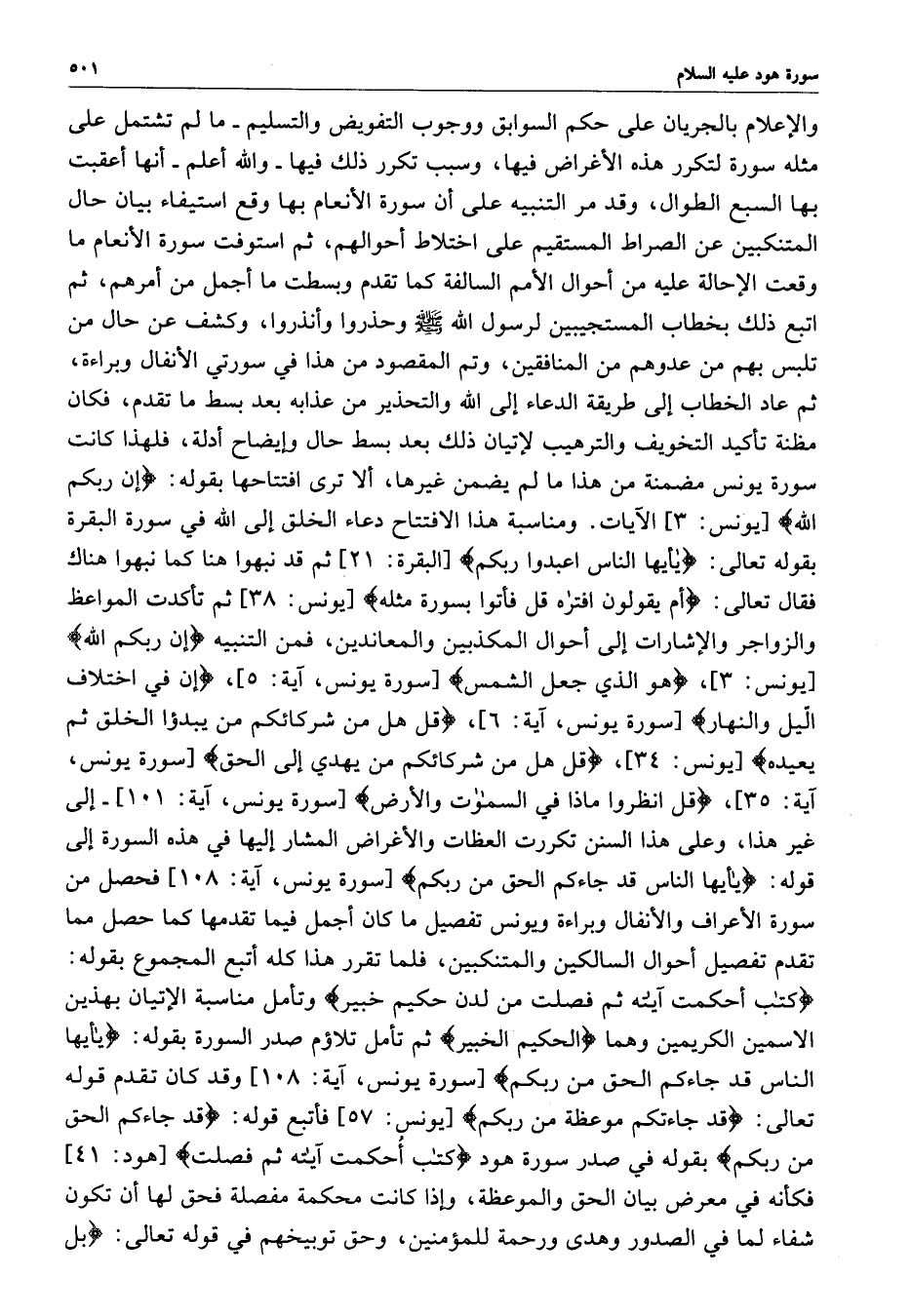 والإعلام بالجريان علىحكم السوابق ووجوب التفويض والتسليم - ما لم تشمل على مثله سورة لتكرر هذه الأغراض فيها ، وسبب تكرر ذلك فيها - والله أعلم - أنها أعقبت بها السبع الطوال ، وقد مر التنبيه على أن سورة الأنعام بها وقع استيفاْ بيان حال المتنكبين عن الصراط المستقيم على اختلاط أحوالهم ، ثم استوفت سورة الأنعام ما وقعت الإحالة عليه من احوال الأمم السالفة كما تقدم وبسطت ما أجمل من أمرهم ، ثم اتبع ذلك بخطاب المستحبين لرسول الله ( صلى الله عليه وسلم ) وحذروا وأنذروا ، وكشف عن حال من تلبس بهم من عدوهم من المنافيقين ، وتم المقصود من هذا في سورتي الأنفال وبراءة ، ثم عاد الخطاب إلى طريقة الدعاء غلى الله ولتحذير من عذابه بعد بسط ما تقدمن فكان مظنة تأكيد التخويف والترهيب لإتيان ذلك بعد بسط حال وإيضاح أدلة ، فلهذا كانت سورة يونس مضمنة من هذت ما لم يضمن غيرها ، ألا ترى افتتاحها بقوله :