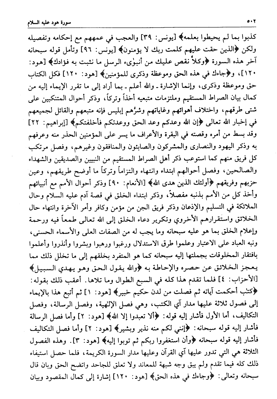 أعقب ذلك بقوله : ( كتاب أحكمت آياته ثم فصلت من لدن حكيم خبير ) [ هود : 1 ] ثم اتبع هذا بالإيماء غلى فصول ثلاثة عليها مدار آي كتب ، وهي فصل الإلهية ، وفصل الرسالة ، وفصل التاكليف ، أما الأول فاشار إليه قوله : ( إلا تعبدوا إلا الله ) [ هود : 2 ] وأما فصل الرسالة فأشار إليه قوله سبحانه : ( إنني لكم منه نذير وبشير ) [ هود : 2 ] وأما فصل التالكيف فأشار إليه قوله سبحانه ) وأن استغفروا ربكم ثم توبوا إليه ) [ هود : 3 ] .