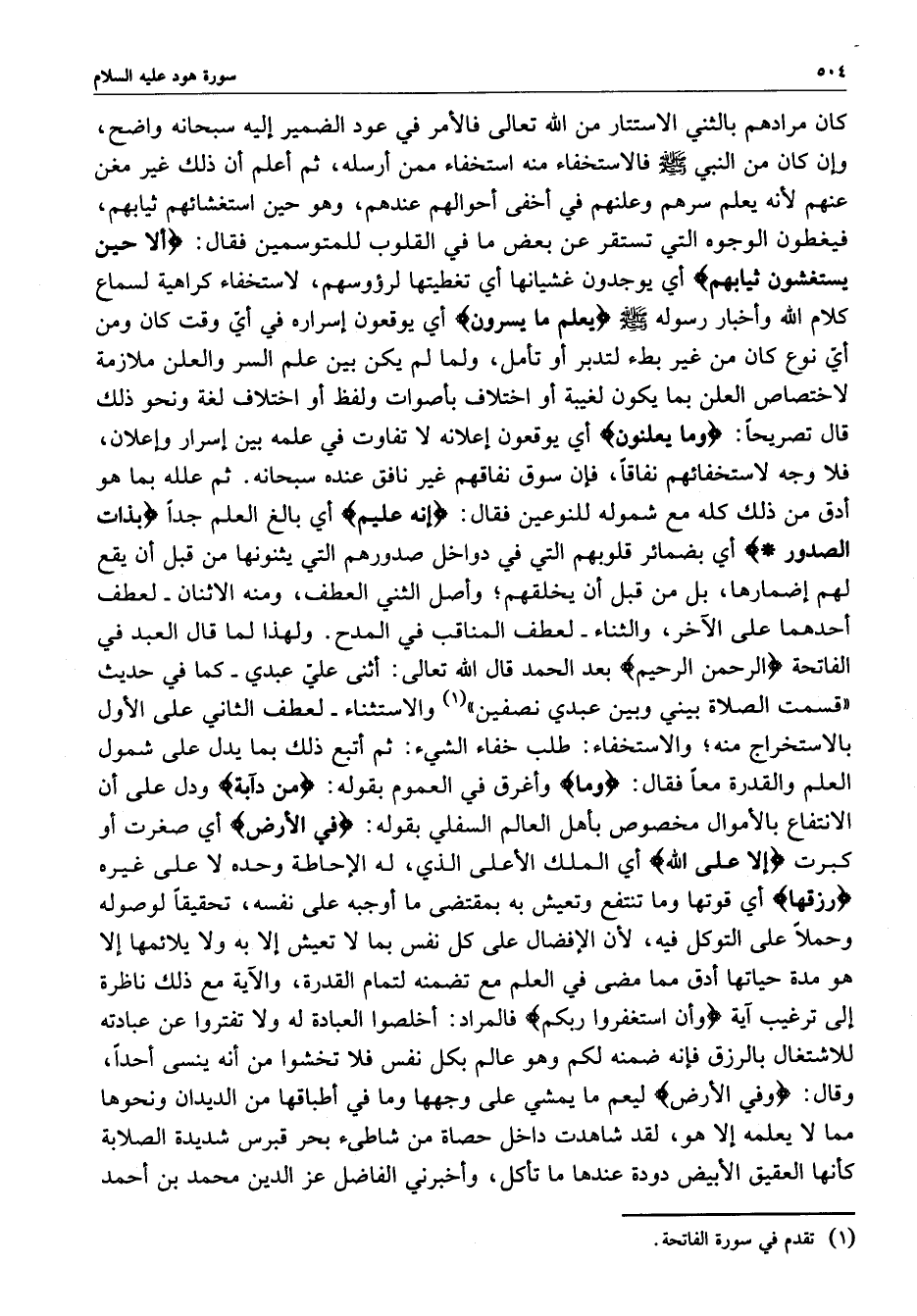 كان مرادهم بالثني الاسستار من الله تعالى فالأمر في عود الضمير غيه سبحانه واضح ، وإن كان من النبي ( صلى الله عليه وسلم ) فالاستخفاء منه استخفاء ممن أرسله ، ثم أعلم أن ذلك غير مغن عنهم لأنه يعلم سرهم وعلنهم في أخفى أحوالهم عندهم ، وهو حين استغشاهم ثيابهم ، فيغطون الوجوه التي تستقر عن بعض ما في القلوب للمتوسمين فقال : ( ألا حين يستغشون ثيابهم ( اي يوجدون غشيانها أي تغطيتها لرؤوسهم ، لاستخفاء كراهية لسماع كلام الله وأخبار رسوله ( صلى الله عليه وسلم ) ) يعلم ما يسرون ) أي يوقعون إسراره في أيّ وقت كان ومن أيّ نوع كان من غير بطء لتدبر أو تأمل ، ولما لم يكن بين علم السر والعلن ملازمة لاختصاص العلن بما يكون لغيبة أو اختلاف بأصوات ولفظ أو اختلاف لغة ونحو ذلك قال تصريحاً : ( وما يعلنون ) أي يوقعون إعلانه لا تفاوت في علمه بين إسرار وإعلان ، فلا وجه لاستخفائهم نفاقاً ، فإن سوق نفاقهم غير نافق عنده سبحانه .