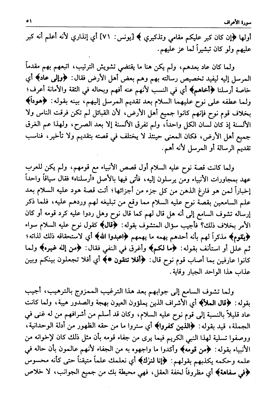 [ يونس : 71 ] أي إنذاري لأنه أعلم أنه كبر عليهم ولو كان تبشيراً لما عز عليهم ولما كان عاد بعدهم ، ولم يكن هنا ما يقتضي تشويش الترتيب ، اتبعهم بهم مقدماً المرسل إليه ليفيد تخصيص رسالته بهموهم بعض اهل الأرض فقال : ( وإلى عاد ( خاصة ارسلنا ) أخاهم ) أي في النسب لأنهم عنه افهم وبحالة في الثقة والأمانة اعرف ؛ ولما عظمه على نوح فإنهم كانوا جميع أهل الأرض ، لأن القبائل لم تكن فرقت الناس ولا الألسنة إذ كان لسان الكل واحداً ، ولم تفرق الألسنة إذ كان لسان الكل واحداً ، ولم تفرق الألسنة إلا بعد الصرح ، ولهذا عم الغرق جميع أهل الأرض ، فكان المعنى حينئذ لا يختلف في قصة بتقديم ولا تاخير ، فناسب تقديم الرسالة أو المرسل لأنه اهم ولما وكانت قصة نوح عليه السلام أول قصص النبياء مع قومهم ، ولم يكن للعرب عهد بمجاورات الأنبياء ومن يرسلون إليه ، فأتى فيها بالأصل ( أرسلناه ) فقال سياقاً واحداً إخباراً لمن هو فارغ الذهن من كل جزء من أجزائها ؛ أتت قصة هود عليه السلام بعدعلم السامعين بقصة نوح عليه السلام مما وقع من تبليغه لهم ودورهم عليه ، فلما ذكر إرساله تشوف السامع إلى انه هل قال لهم كما قال نوح وهل ردوا عليه كرد قومه أو كان الأمر بخلاف ذلك ؟ فأجيب سؤال المتشوف بقوله : ( قال ( كقوله نوح عليع السلام سواء ) ياقوم ( مذكراً لهم بانه احدهم يهمه ما يهمهم ) اعبدوا الله ( اي لا ستحقاقه ذلك لذاته ؛ ثم علل أو أستأنف بقوله : ( ما لكم ( وأغرق في النفي فقال : ( من إله غيره ( كانوا عارفين بما اصاب قوم نوح قال : ( افلا تتقون ( اي أفلا تجعلون بينكم وبين عذاب هذا الواحد الجبار وقاية ولما تشوف السامع إلى جوابهم بعد هذا الترغيب الممزوج بالترهيب ، أجيب بقوله ) قال الملأ ) أي الأشراف الذين يملؤون العيون بهجة والصدور هيبة ولما كانت عاد قليلاًبالنسبة إلى قوم نوح عليه السلام ، وكان قد أسلم من أشرافهم من له غنى في الجملة ، قيد بقوله : ( الذين كفروا ) أي ستروا ما من حقه الظهور من ادلة الوحدانية ، ووصفوا تسلية لهذا النبي الكريم فيما يرى من جفاء قومه بأن مثل ذلك كان لإخوانه من الأنبياء بقوله ) من قومه ( وأكدوا ما وجهوه به من الجفاء لأنهم عالمون بان حاله في عمله وحكمه يكذبهم بقولهم : ( إنا لنراك ( اي لنعلمك علماً متيقناً حتى كانه محسوس ) في سفاهة ( اي مظروفاً لخفة العقل ، فهي محيطة بك من جميع الجوانب ، لا خلاص