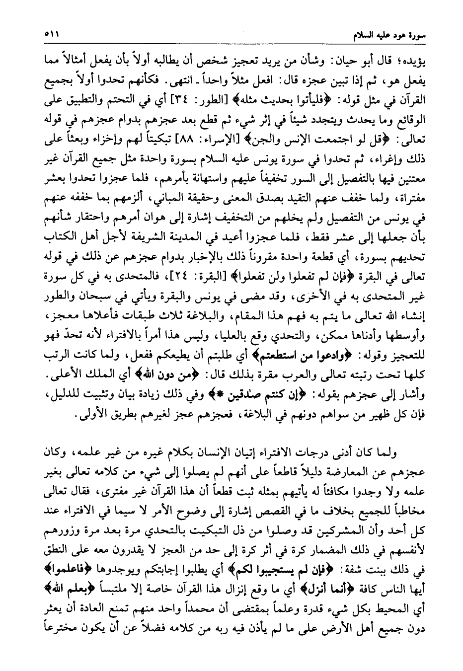 [ الإسراء : 88 ] تبكيتاً لهم وإخزاء وبعثاً على ذلك وإغراء ، ثم تحدوا في سورة يونس عليه السلام بسورة واحدة مثل جميع القرآن غير معتنين فيها بالتفصيل إلى السور تخفيفاً عليهم واستهانة بأمرهمن فلما عجزوا تحدوا بعشر مفتراه ، ولما خفف عنهم التقيد بصدق المعنى وحقيقة المباني ، ألزمهم بما خففه عنهم في يونس من التفضيل ولم يخلهم من التخفيف إشارة إلى هوان أمرهم واحتقار شانهم بأن جعلها غلى عشر فقط ، فلما عجزوا أعيد في المدينة الشريفة لأجل أهل الكتاب تحديهم بسورة ، أي قطعة واحدة مقروناً ذلك بالإخبار بدوام عجزهم عن ذلك في قوله تعالى في البقرة