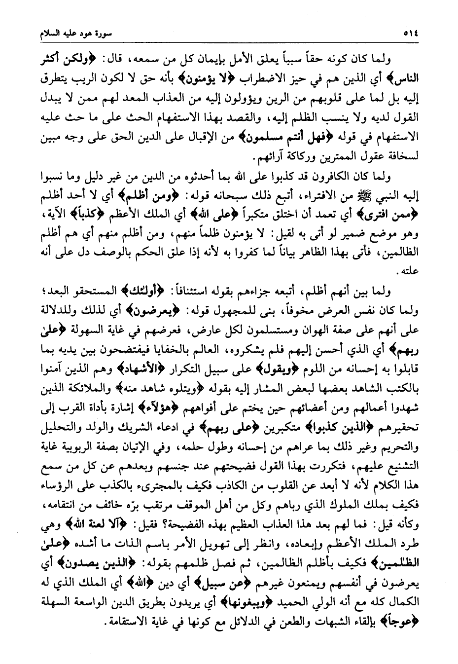 ولما بين أنهم أظبمن اتبعه جزاءهم بقوله استئنافاً : ( أولئك ( المستحقو البعد ؛ ولما كان نفس العرض نخوفاً ، بنى للمجهول قوله : ( يعرضون ) أي لذلك ولدلالة على أنهم على صفة الهوان ومستسلمون لكل عارض ، فعرضهم في غاية السهولة ) على ربهم ) أي الذي أحسن إليهم فلم يشكروه ، العالم بالخفايا فيفتضحون بين يديه بما قابلوا به إحسانه من اللوم ) ويقول ( على سبيل التكرار ) الأشهاد ( وهم الذين آمنوا بالكتب الشاهد بعضها لبعض المشار إليه بقوله ) ويتلوه شاهد منه ( والملائكة الذين شهدوا أعمالهم ومن أعضائهم حين يختم على افواههم ) هؤلاء ( إشارة بأداة القرب غلى تحقيرهم ) الذين كذبوا ( متكبرين ) على ربهم ( في ادعاء الشريك والولد والتحليل والتحريم وغير ذلك بما عراهم من إحسانه وطول حلمه ، وفي الإتيان بصفة الربوبية غاية التشنيع عليهم ، فتكررت بها القول فضيحتهم عند جنسهم وبعدهم عن كل من سمع هذا الكلام لأنه لا أبعد عن القلوب من الكاذب فكيف بالمجترىء بالكذب على الؤساء فكيف بملك الملوك الذي رباهم ولك من أهل الموقف مرتقب برّه خائف من انتقامه ، وكأنه قيل : فما لهم بعد هذا العذاب العظيم بهذه الفضيحة ؟ فقيل : ( آلا لعنة الله ( وهي طرد الملك الأعظم وإبعادهن انظر إلى تهويل الأمر باسم الذات ما اشده ) على الظالمين ( فكيف بأظلم الظالمين ، ثم فصل ظلمهم بقوله : ( الذين يصدون ( اي يعرضون في أنفسهم ويمنعون غيرهم ) عن سبيل ) أي دين ) الله ) أي الملك الذي له الكمال كله مع أنه الولي الحميد ) ويبغونها ( اي يريدون بطريق الدين الواسعة السهلة ) عوجاً ( بإلقاء الشبهات والطعن في الدلائل مع كونها في غاية الاستقامة .