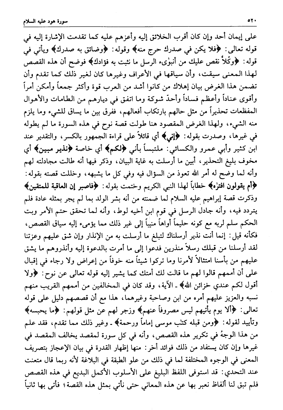 على إيمان أحد وإن كان أقرب الخلائق إليه وأعزهم عليه كما تقدمت الإشارة إليه في قوله تعالى : ( فلا يكن في صدرك حرج منه ( وقوله : ( وضائق به صدرك ( ويأتي في قوله : ( وكُلاًّ نقص عليك من أنباء الرسل ما نثبت به فؤادك ( فوضح أن هذه القصص لهذا المعنى سيقت ، وأن سياقها في الأعراف وغيرها كان لغير ذلك كما تقدم وأن تضمن هذا الغرض بيان إهلاك من كانوا أشد من العرب قوة وأكثر جمعاً وأمكن أمراً واقوى عناداً وأعظم فساداً وأحدّ شوكة وما اتفق في ديارهم من الطامات والأهوال المفظعات تحذيراً من مثل حالهم بارتكاب افعالهم ، ففرق بين ما يساق للشيء وما يلزم منه الشيء ، ولهذا الغرض المقصود هنا طولت قصة نوح في هذه السورة ما لم يطوله في غيرها ، وصدرت بقوله : ( إني ( اي قائلاً على قراءة الجمهور بالكسر ، والتقدير عند ابن كثير وأبي عمرو والكسائي : ملتبساً بأني ) لكم ) أي خاصة ) نذير مبين ( اي مخوف بليغ التحذير ، أبين ما أرسلي له غاية البيان ، وذكر فيها أنه طالت مجادلته لهم وأنه لما اوضح له أمر الله تعوذ من السؤال فيه وفي كل ما يشبهه ، وخللت قصته بقوله : ( أم يقولون افتراه ( خطاباً لهذا النبي الكريم وختمت بقوله : ( فاصبر إن العاقبة للمتقين ( وذكرت قصة إبراهيم عليه السلام لما ضمنته من أنه بشر الولد بما لم يجر بمثله عادة فلم يتردد فيه ، وأنه جادل الرسل في قوم ابن أخيه لوط ، وأنه لما تحقق حتم الأمر وبت الحكم سلم لربه مع كونه حليماً أواهاً منيباً إلى غير ذلك مما يؤمىء إليه سياق القصص ، فكأنه قيل : إنما أنت نذير أرسلناك لتبلغ ما أرسلت به من الإنذار وإن شق عليهم وعزتنا لقد ارسلنا من قبلك رسلاً منذرين فدعوا إلى ما أمرت بالدعوة إليه وأنذروهم ما يششق عليهم من بأسنا امتثلاً لأمرنا وما تركوا شيئاً منه خوفاً من إعراض ولا رجاء في إقبال على أن أممهم قالوا لهم ما قالت لك أمتك كما يشير إليه قوله تعالى عن نوح : ( ولا اقول لكم عندي خزائن الله ( - الآية ، وقد كان في المخالفين من أممهم القريب منهم نسبه والعزيز عليهم أمره من ابن وصاحبة وغيرهما ، هذا مع أن قصصهم دليل على قوله تعالى : ( ألا يوم يأتيهم ليس مصروفاً عنهم ( وزجر لهم عن مثل قولهم : ( ما يحبسه ( وتأييد لقوله : ( ومن قبله كتاب موسى إماماً ورحمة ( - وغير ذلك مما تقدم ، فقد علم من هذا الوجهُ في تكرير هذه القصصن وأنه في كل سورة لمقصد يخالف المقصد في غيرها وإن كان يستفاد من ذلك فوائد أخر : منها إظهار القدرة في بيان الإعجاز بتصريف المعنى في الوجوه المختلفة لما في ذلك من علو الطبقة في البلاغة لأنه ربما قال متعنت عند التحدي : قد استوفى اللفظ البليغ إلى الأسلوب الأكمل البديع في هذه القصص فلم تبق لنا ألفاظ نعبر بها عن هذه المعاني حتى نأتي بمثل هذه القصة ؛ فأتى بها ثانياً
