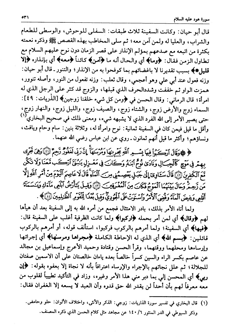 ) وَقَالَ ارْكَبُواْ فِيهَا بِسْمِ اللَّهِ مَجْرَاهَا وَمُرْسَاهَا إِنَّ رَبِّي لَغَفُورٌ رَّحِيمٌ وَهِيَ تَجْرِي بِهِمْ فِي مَوْجٍ كَالْجِبَالِ وَنَادَى نُوحٌ ابْنَهُ وَكَانَ فِي مَعْزِلٍ يبُنَيَّ ارْكَبَ مَّعَنَا وَلاَ تَكُن مَّعَ الْكَافِرِينَ قَالَ سَآوِي إِلَى جَبَلٍ يَعْصِمُنِي مِنَ الْمَآءِ قَالَ لاَ عَاصِمَ الْيَوْمَ مِنْ أَمْرِ اللَّهِ إِلاَّ مَن رَّحِمَ وَحَالَ بَيْنَهُمَا الْمَوْجُ فَكَانَ مِنَ الْمُغْرَقِينَ وَقِيلَ يأَرْضُ ابْلَعِي مَآءَكِ وَيسَمَآءُ أَقْلِعِي وَغِيضَ الْمَآءُ وَقُضِيَ الأَمْرُ وَاسْتَوَتْ عَلَى الْجُودِيِّ وَقِيلَ بُعْداً لِّلْقَوْمِ الظَّالِمِينَ ( ( )
