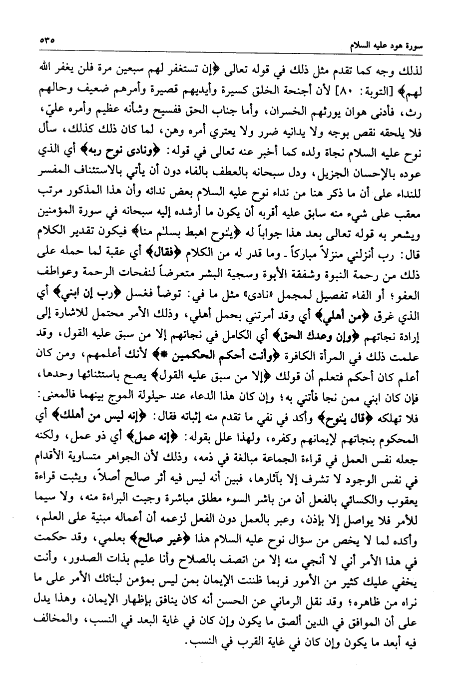 [ التوبة : 80 ] لأن أجنحة الخلق كسيرة وأيديهم قصيرة وأمرهم ضعيف وحالهم رث ، فادنى هوان يورثهم الخسران ، وأما جناب الحق ففسيح وشأنه عظيم وأمره عليّ ، فلا يلحقه نفص بوجه ولا يداينه ضرر ولا يعتري أمره وهن ، لما كان ذلك كذلك ، سال نوح عليه السلام نجاة ولده كما أخبر عنه تعالى في قوله : ( ونادى نوح ربه ( اي الذي عوده بالإحسان الجزيل ، ودل سبحانه بالعطف بالفاء دون أن يأتي بالاستئناف المفسر للنداء على أن ما ذكر هنا من نداء نوح عليه السلام بعض ندائه وأن هذا المذكور مرتب معقب على شيء منه سابق عليه أقربه أن يكون ما أرشده إليه سبحانه في سورة المؤمنين ويشعر به قوله تعالى بعد هذا جواباً له ) يا نوح اهبط منها بسلام منا ( فيكون تقدير الكلام قال : رب أنزلني منزلاً مباركاً - وما قدر له من الكلام ) فقال ( اي عهقبة لما حمله على ذلك من رحمة النبوة وشفقة الأبوة وسجية البشر متعرضاً لنفحات الرحمة وعواطف العفو ؛ أو الفاء تفصيل لمجمل ( نادى ) مثل ما في : توضأ فغسل ) رب إن ابني ) أي الذي غرق ) من أهلي ) أي وقد أمرتني بحمل أهلي ، وذلك الأمر محتمل للإشارة إلى إرادة نجاتهم ) وإن وعك الحق ) أي الكامل في نجاتهم إلا من سبق عليه القول ، وقد علمت ذلك في المرأة الكافرة ) وأنت أحكم الحاكمين ( لأنك أعلمهم ، ومن كان أعلم كان أحكم فتعلم أن قولك ) إلا من سبق عليه القول ( يصح باستثنائها وحدها ، فإن كان ابني ممن نجا فأتني به ؛ وإن كان هذا الدعاء عند حيلولة الموج بينهما فالمعنى : فلا تهلكه ) قال يا نوح ( وأكد في نفي ما تقدم منه إثباته فقال : ( إنه ليس من أهلك ) أي المحكوم بنجاتهم لإيمانهم وكفره ، ولهذا علل بقوله : ( إنه عمل ) أي ذو عمل ، ولكنه جعله نفس العمل في قراءة الجماعة مبالغة في ذمه ، وذلك لأن الجواهر متساوية الأقدام في نفس الوجود لا تشرف إلا بآثارها ، فين أنه ليس فيه أثر صالح أصلاً ، ويثبت قراءة يعقوب والكسائي بالفعل أن من باشر السوء مطلق مباشرة وجبت البراءة منه ، ولا سيما للأمر فلا يواصل إلا بإذن ، وعبر بالعمل دون الفعل لزعمه أن أعماله مبنية على العلم ، وأكده لما لا يخص من سؤال نوح عليه السلام هذا ) غير صالح ( بعلمي ، وقد حكمت في هذا الأمر أني لا أنجي منه إلا من اتصف بالصلاح وأنا عليم بذات الصدور ، وأنت يخفي عليك كثير من الأمور فربما ظننت الإيمان بالصلاح وأنا عليم بذات الصدور ، وأنت يخفي عليك كثير من الأمور فربما ظننت الإيمان بمن ليس بؤمن لبنائك الأمر على ما نراه من ظاهره ؛ وقد نقل الرماني عن الحسن أنه كان ينافق بإظهار الإيمان ، وهذا يدل على أن الموافق في الدين ألصق ما يكون وإن ان في غاية البعد في النسب ، والمخالف فيه ابعد ما يكون وإن كان في غاية القرب في النسب .