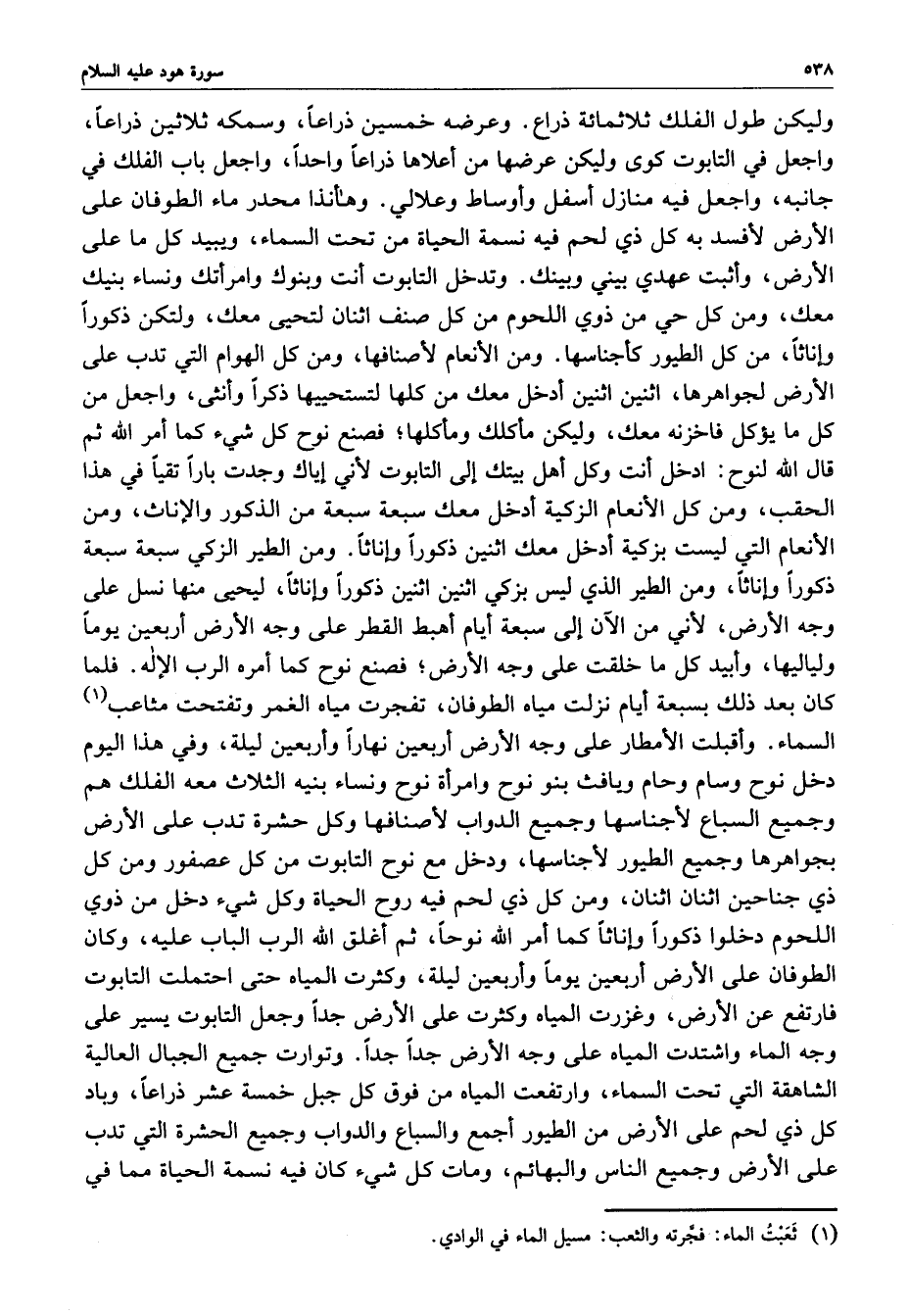وعرضه خمسين ذراعاً ، وسمكه ثلاثين ذراعاً ، واجعل في التابوت كوى وليكن عرضها من أعلاها ذراعاً واحداً ، واجعل باب الفلك في جانبه ، واجعل فيه منازل أسفل وأوساط وعلالي .