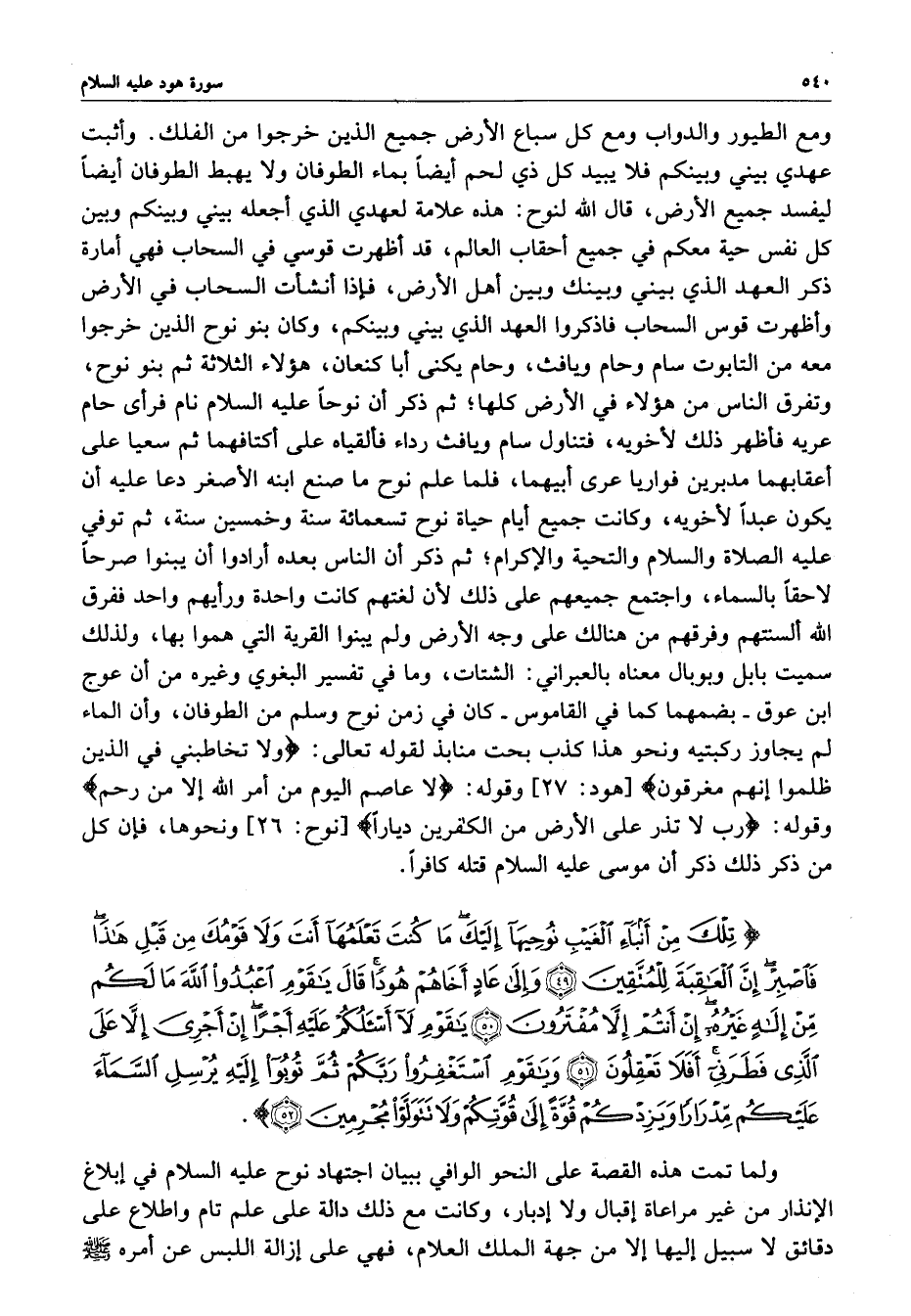 وأثبت عهدي بيني وبينكم فلا يبيد كل ذي لحم أيضاً بماء الطوفان ولا يهبط الطوفان أيضاً ليفسد جميع الأرض ، قال الله انوح : هذه علامة لعهدي الذي أجعله بيني وبينكم وبين كل نفس حية معكم في جميع أحقاب العالم ، قد أظهرت قوسي في السحاب في الأرض وأظهرت قوس السحاب فاذكروا العهد الذي بيني وبينك وبين أهل الأرض ، فإذا أنشأت السحاب في الأرض وأظهرت قوس التابوت سام وحام ويافث ، وحاتم يكنى أبا كنعان ، هؤلاء الثلاثة ثم بنو نوح ، وتفرق الناس من هؤلاء في الأرض كلها ؛ ثم ذكر ان نوحاً عليه السلام نام فرأى حام عريه فأظهر ذلك لأخويه ، فتناول سام ويافث رداء فألقياه على أكتافهما ثم سعيا على أعقابهما مدبرين فواريا عررى أبيهما ، فلما علم نوح ما صنع ابنه الأصغر دعا عليه أن يكون عبداً لأخويه ، وكانت جميع ايام حياة نوح تسعمائة سنة وخمسين سنة ، ثم توفي عليه الصلاة ولاسلام والتحية والإكرام ؛ ثم ذكر أن الناس بعده أرادوا أن يبنوا صرحاً لاحقاً بالسماء ، واجتمع جميعهم على ذلك لأن لغتهم كانت واحدة ورايهم واحد ففرق الله ألسنتهم وفرقهم من هنالك على وجه الأرض ولم يبنوا القرية التي هموا بها ، ولذلك سمين بابل وبوبال معناه بالعبراني : الشتات ، وما في تفسير الغوي وغيره من أن عوج ابن عوق - بضمهما كما في القاموس - كان في زمن نوح وسلم من الطوفان ، وأن الماء لم يجاوز ركبتيه ونحو هذا كذب بحت منابذ لقوله تعالى : ( ) ولا تخاطبني في الذين ظلموا إنهم مغرقون ( ) [ هود : 27 ] وقوله : ( ) ا عاصم اليوم من أمر الله إلا من رحم ( ( وقوله : ( ) رب لا تذر على الأرض من الكافرين دياراً ( ) [ نوح : 26 ] ونحوها ، فإن كل من ذكر ذلك ذكر أن موسى عليه السلام قتله كافراً .