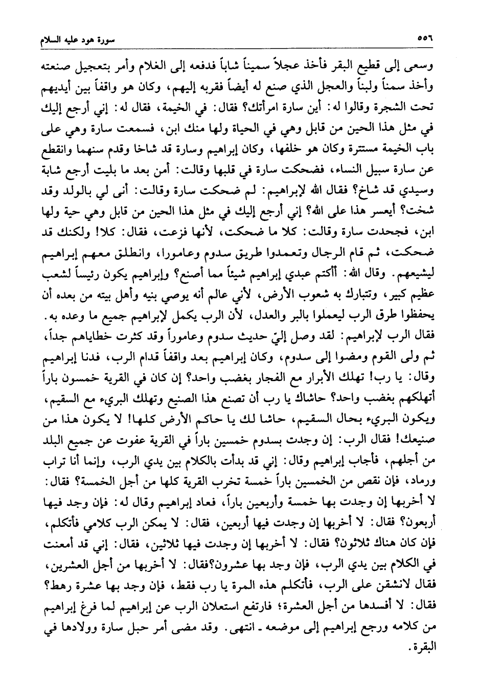فقال الرب لإبراهيم : لقد وصل إليّ حديث سدوم وعاموراً وقد كثرت خطاياهم جداً ، ثم ولى القوم ومضوا إلى سدوم ، وكان إبراهيم بعد واقفاً قدام الرب ، فدنا إبراهيم وقال : يا رب تهلك الأبرار مع الفجار بغضب واحد ؟ إن كان في القرية خمسون باراً أهلكهم بغضب واحد ؟ حاشاك يا رب أن تصنع هذا الصنيع وتهلك البريء مع السقيم ، ويكون البريء بحال السقيم ، حاشا لك يا حاكم الأرض كلها لا يكون هذا من صنيعك فقال الرب : إن وجدت بسدوم خمسين باراً في القرية عفوت عن جميع البلد من أجلهم ، فأجاب إبراهيم وقال : إني قد بدأت بالكلام بين يدي الرب ، وإنما أنا تراب ورماد ، فإن نقص من الخمسين باراً خمسة تخرب القرية كلها من أجل الخمسة ؟ فقال : لا أخربها إن وجدت بها خمسة وأربعين باراً ، فعاد إبراهيم وقال له : فإن وجد فيها أربعون ؟ فقال : لا أخربها إن وجدت فيها أربعين ، فقال : لا يمكن الرب كلامي فأتكلم ، فإن كان هناك ثلاثون ؟ فقالك لا أخربها إن وجدت فيها ثلاثين ، فقال : إني قد أمعنت في الكلام بين يدي الرب ، فإن وجد بها عشرون ؟ فقال : لا أخربها من أجل العشرين ، فقال لانشقن على الرب ، فأتكلم هذه المرة يارب فقط ، فإن وجد بها عشرة رهط ؟ فقال : لا أفسدها من أجل العشرة ؛ فارتفع استعالن الرب عن إبراهيم لما فرغ إبراهيم من كلامه ورجع إبراهيم إلى موضعه - انتهى .