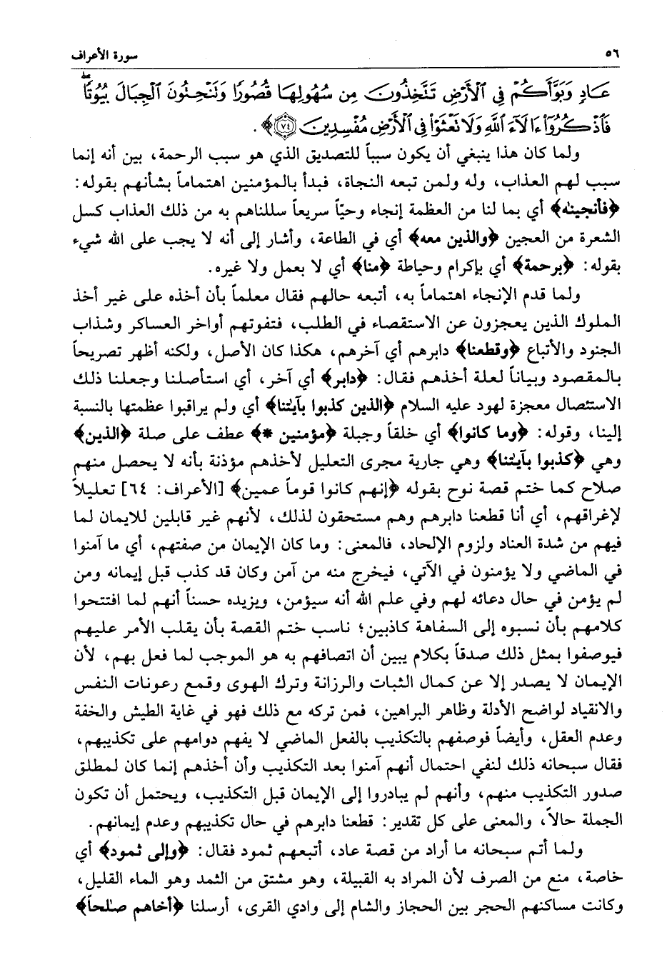 [ الأعراف : 64 ] تعليلاً لإغراقهم ، أي أنا قطعنا دابرهم وهم مستحقون لذلك ، لأنهم غير قابلين للايمان لما فيهم من شدة العنادولزوم الإلحاد فالمعنى : وما كان الإيمان من صفتهم ، أي مآمنوا في الماضي ولا يؤمنون في ىلآتي ، فيخرج منه من آمن وكان قد كذب قبل إيمانه ومن لم يؤمن في حال دعائه لهم وفي علم الله انه سيؤمن ، ويزيده حسناً أنهم لما افتتحوا كلامهم بان نسبوه إلى السفاهة كاذبين ؛ ناسب ختم القصة بان يقلب الأمر عليهم فيوصفوا بمثل ذلك صدقاً بكلام يبين أن اتصافهم به هو الموجب لما فعل بهم ، لأن الإيمان لا يصدر إلا عن كمال الثبات والرزانة وترك الهوى وقمع رعونات النفس والانقياد لواضح الأدلة وظاهر البراهين ، فمن تركه مع ذلك فهو في غاية الطيش والخفة وعدم العقل ، وأيضاً فوصفهم بالتكذيب وان أخذهم إنما كان المطلق صدور التكذيب منهم ، وانهم لم يبادروا إلى الإيمان قبل التكذيب ، ويحتمل ان تكون الجملة حالاً ، والمعنى على كل تقدير : قطعنا دابرهم في حال تكذيبهم وعدم إيمانهم ولما أتم سبحانه ما اراد من قصة عاد ، اتبعهم ثمود فقال ) وإلى ثمود ) أي خاصة ، منع من الصرف لأن المراد به القبيلة ، وهو مشتق من الثمد وهو اتلماء القليل ، وكانت مسامنهم الحجر بين الحجار والشام إلى وادي القرى ، أرسلنا ) أخاهم صالحاً (