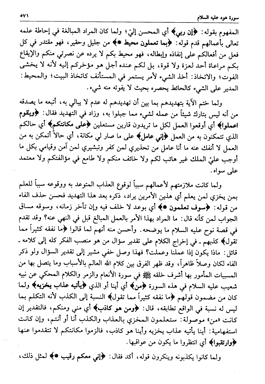 وأحسن منه نهم لما قالوا ) ما نفقه كثيراً مما تقول ( كذبهم - في إخراج الكلام على تقدير سؤال من هو منصب الفكر كله إلى كلامه - قائل : ماذا يكون إذا عملنا وعملت ؟ فهذا وصل خفي مشير إلى تقدير السؤال ولو ذكر الفاء لكان وصلاً ظاهراً ، وقد ظهر الفرق بين كلام العالم بالإسباب وما يتصل بها من المسبباب المأمور بها اشرف خلقه ( صلى الله عليه وسلم ) في سورة الأنعام والزمر والكلام المحكي عن نبيه شعيب عليه السلام في هذه السورة ) من ) أي أينا أو الذي ) يأتيه عذاب يخزيه ( ولما كان من مضمون قولهم ) ما نفقه كثيراً مما تقول ( النسبة إلى الكذب لأنه التكلم بما ليس له نسبة في الواقع تطابقه ، قال : ( ومن هو كاذب ) أي مني ومنكمن فالتقدير إن كانت ( من ) موصولة : ستعلمون المخزي بالعذاب والكذب أنا وأنتم ، وإن كانت استفهامية : أينا يأتيه عذاب يخزيه وأينا هو كاذب ، فالزموا مكانتكم لا تتقدموا عنها ) وارتقبوا ) أي انتظروا ما يكون من عواقبها .