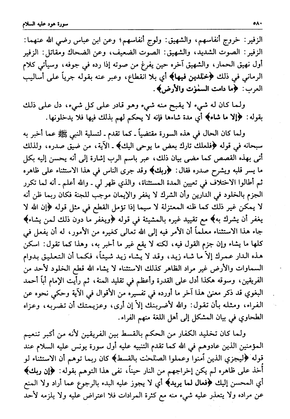 ولما كان الحلا في هذه السورة مقتضياً - كما تقدم - لتسلية النبي ( صلى الله عليه وسلم ) عما أخبر به سبحانه في قوله ) فلعلك تارك بعض ما يوحى إليك ( - الآية ، من ضيق صدره ، ولذلك أتى بهذه القصص كما مضى بيان ذلك ، عبر باسم الرب إشارة إلى أنه يحسن إليه بكل ما يسر قلبه ويشرح صدره فقال : ( ربك ( وقد جرى الناس في هذا الاستثناء على ظاهرة ثم أطالوا الاختلاف في تعيين المدة المستثناة ، والذي ظهر لي - والله أعلم - أنه لما تكرر الجزم بالخلود في الدارين وأن الشرك لا يغفر والإيمان موجب للجنة فكان ربما ظن أنه لا يمكن غير ذلك كما ظنه المعتزلة لا سيما إذا تؤم القطع في مثل قوله ) أن الله لا يغفر أن يشرك به ( مع تقييد غيره بالمشيئة في قوله ) ويغفر ما دون ذلك لمن يشاء ( جاء هذا الاستثناء معلماً أن الأمر فيه إلىالله تعالى كغيره من الأمور ، له ان يفعل في كلها ما يشاء وإن جزم القولفيه ، لكنه لا يقع غير ما أخبر به ، وهذا كما تقول : اسكن هذه الدار عمرك إلاّ ما شاء زيد ، وقد لا يشاء زيد شيئاً ، فكما أن التعليق بدوام السماوات والأرض غير مراد الظاهر كذلك الاستثناء لا يشاء الله قطع الخلود لأحد من الفريقين ، وسوقه هكذا أدل على الدرة وأعظم في تقليد المنة ، ثم رأيت الإمام اباً أحمد البغوي قد ذكر معنى هذا آخر ما أورده في تفسيره من الأقوال في الآية وحكي نحوه عن الفراء ، ومثله بأن تقول : والله لأضربنك إلاّ إن أرى ، وعزيمتك أن تضربه ، وعزاه الطحاوي في بيان المشكل إلى أهل اللغة منهم الفراء .