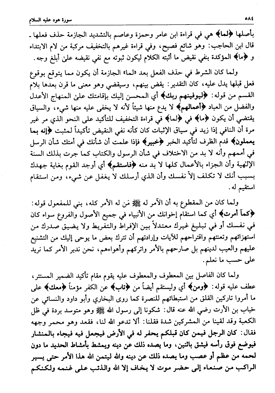 ولما كان الشرط في حذف الفعل بعد ( لما ) الجازمة أن يكون مما يتوقع بوقوع فعل قبلها يدل عليه ، كان التقدير : يقض بينهم ، وسيقضي وهو معنى ما قرن بعدها بلام القسم من قوله : ( ليوفينهم ربك ) أي المحسن إليك بإقامتك على المنهاج والأعدل والفضل من العباد ) أعمالهم ( لا يدع منها شيئاً لأ ، ه لا يخفى عليه منها شيء ، والسياق يقتضي أن يكون ) ما ( في ) لما ( في قراءة التخفيف للتأكيد على النحو الذي مر غير مرة أن النافي إذا زيد في سياق الإثبات كان كأنه نفي النقيض تأكيداً لمثبت ) إنه بما يعملون ( قدم الظرف لتأكيد الخبر ) خبير ( فإذا علمت أن شأنك في أمتك لمثبت ) إنه بما يعملون ( قدم الظرف لتأكيد الخبر ) خبير ( فإذا علمت أن شأنك في أمتك شأن الرسل في أممهم وأنه لا بد من الاختلاف في شأن الرسول والكتاب كما جرت بذلك السنة الإلهية وأن الجزاء بالأعمال كلها لا يد منه ) فاستقم ) أي أوجد القوم بغاية جهدك بسبب أنك لا تلكف إلاّ نفسك وأن الذي ارسلك لا يغفل عن شيء ، ومن استقام استقيم له .