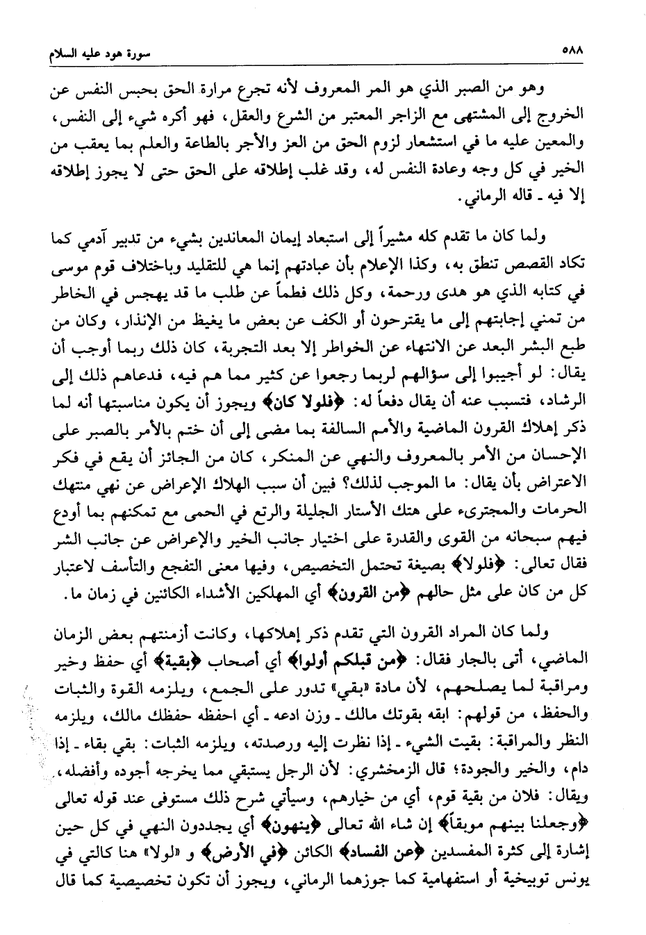 ولما كان المراد القرون التي تقدم ذكر إهلاكها ، وكانت أزمتهم بعض الزمان الماضي ، أتى بالجار فقال : ( من قبلكم أولوا ) أي أصحاب ) بقية ) أي حفظ وخير ومراقبة لما يصلحهم ، لأن مادة ( بقي ) تدور على الجمع ، ويلزمه القوة والثبات والحفظ ، من قولهم : ابقه بقوتك مالك - وزن ادعه - أي احفظه حفظك مالك ، ويلزمه النظر والمراقبة : بقيت الشيء - إذا نظرت إليه ورصدته ، ويلزمه الثبات : بقي بقاء - إذا دام ، والخير والجودة ؛ قال الزمخشري : لأن الرجل يستبقي مما يخرجه أجوده وافضله ، ويقال : فلان من بقية قوم ، اي من خيارهم ، وسيأتي شرح ذلك مستوفى عند قوله تعالى ) وجعلنا بينهم موبقاً ( إن شاء الله تعالى ) ينهون ) أي يجددون النهي في كل حين إشارة غلى كثرة المفسدين ) عن الفساد ( الكائن ) في الأرض ( و ( لولا ) هنا كالتي في يونس توبيخية أو استفامية كما جوزهما الرماني ، ويجوز ان تكون تخصيصية كما قال