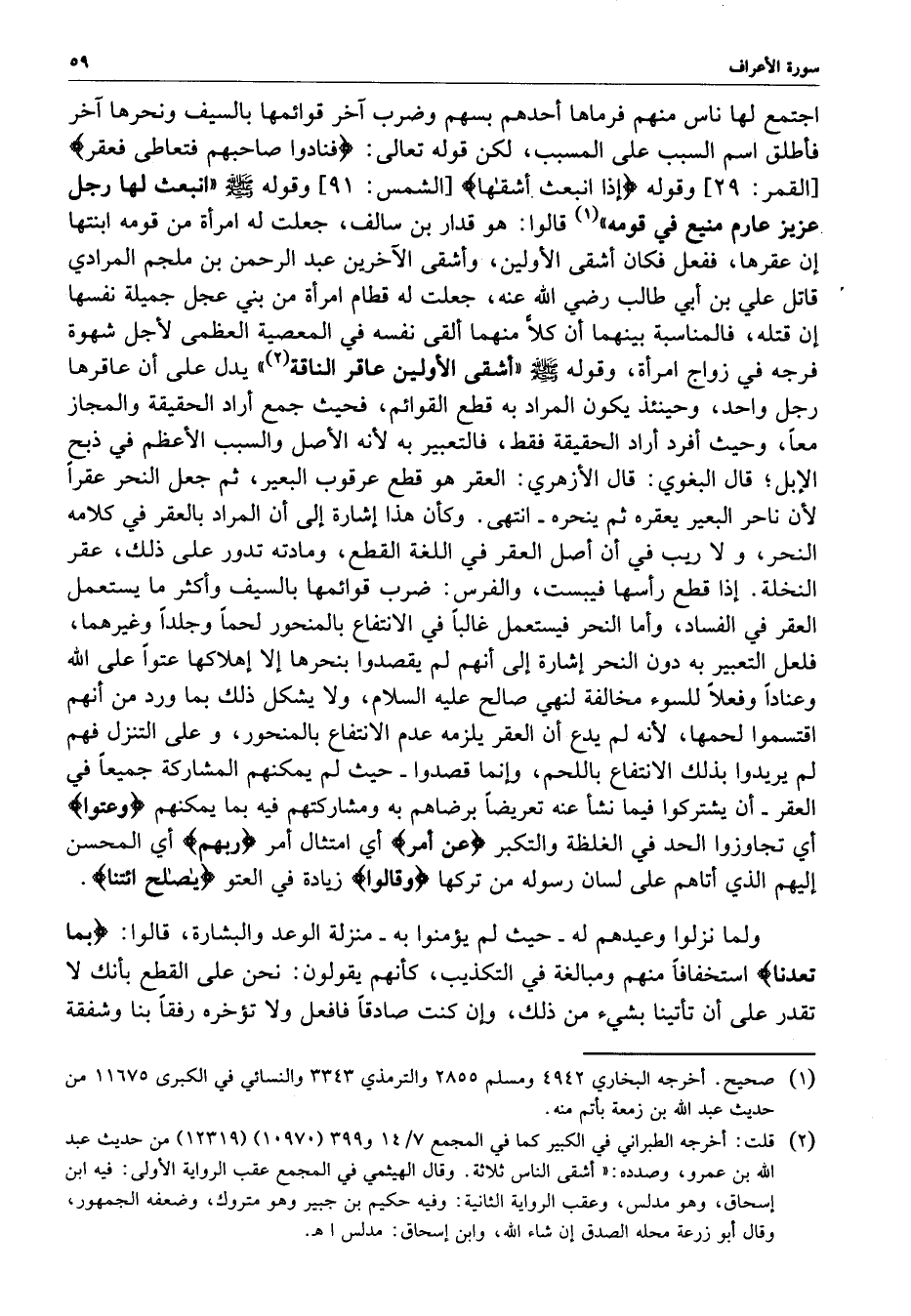 الشمس : 91 ] وقوله ( صلى الله عليه وسلم ) ( انبعث لها رجل عزيز عارم منيع في قومه ) قالوا : هو قدار بن سالف ، جعلت له امرأة من قومه ابنتها إن عقرها ، ففعل فكان أشقى الأولين ، وأشقى الاخرين عبد الرحمن بن ملجم المرادي قاتل علي بن أبي طالب رضي الله عنه ، جعلت له قطام امرأة من بني عجل جميلة نفسها إن قتله ، فالمناسبة بينهما أن كلاّ منهما ألقى نفسه في المعصية العظمى لأجل شهوة فرجه في زواج امراة ، وقوله ( صلى الله عليه وسلم ) ( اشقى الأولين عاقر الناقة ) يدل على أن عاقرها رجل واحد ، وحينئذ يكون المراد به قطع القوائم ، فحيث جمع أراد الحقيقة والمجاز معاً ، وحيث أفراد ألااد الحقبقة فقط ، فالتعبير به لأنه الصل والسبب الأعظم في ذبح الإبل ؛ قال البغوي : قال الأزهري : العقر هو قطع عرقوب البعير ، ثم جعل النحر عقراً لأن ناحر البعير يعقره ثم ينحره - انتهى .
