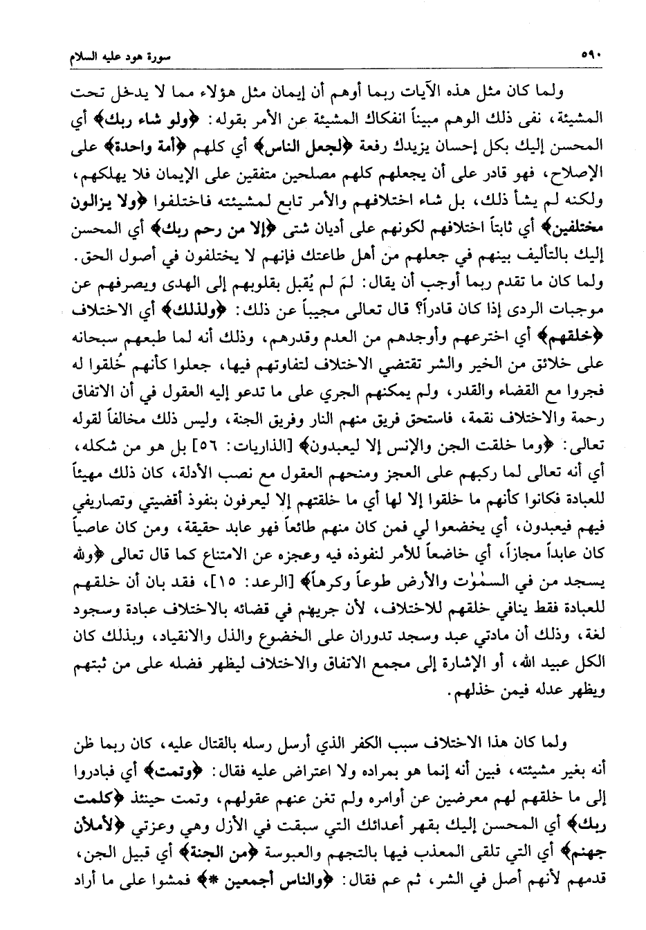 ولما كان هذا الاختلاف سبب الكفر الذي ارسل رسله بالقتال عليه ، كان ربما ظن أنه بغير مشيته ، فين أنه هو بمراده ولا اعتراض عليه فقال : ( وتمت ) أي فبادروا إلى ما خلقهم لهم معرضين عن أوامره ولم تغن عنهم عقولهم ، وتمت حينئذ ) كلمت ربك ) أي المحسن إليك بقهر أعدائك التي سبقت في الأزل وهي وعزتي ) ملأن جهنم ) أي لتي تلقى المعذب فيها بالتجهم والعبوسة ) من الجنة ) أي قبيل الجنن قدمهم لأنهم اصل في الشر ، ثم عم فقال : ( والناس أجمعين ( فمشوا على ما أراد