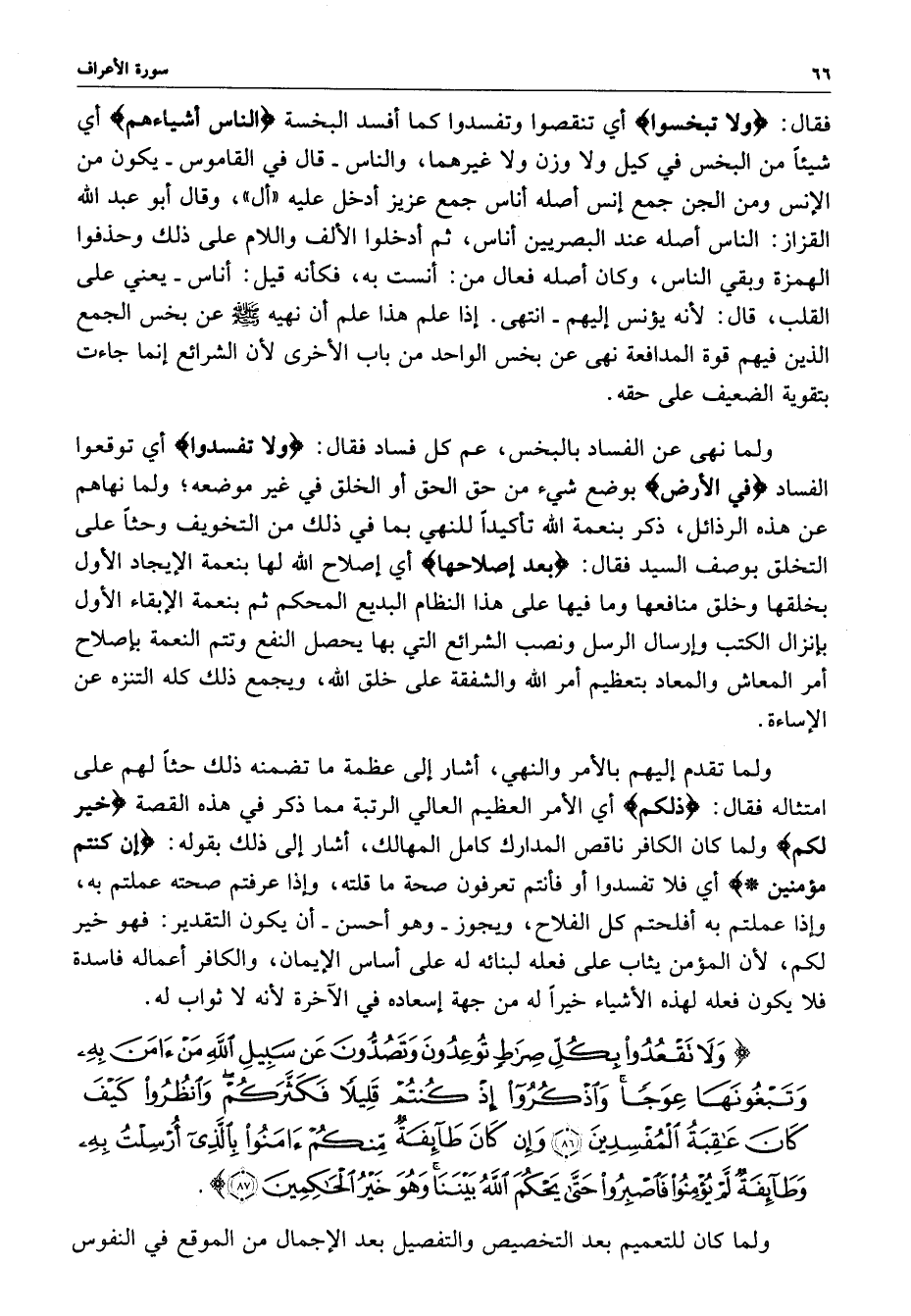 ) وَلاَ تَقْعُدُواْ بِكُلِّ صِرَاطٍ تُوعِدُونَ وَتَصُدُّونَ عَن سَبِيلِ اللَّهِ مَنْ آمَنَ بِهِ وَتَبْغُونَهَا عِوَجاً وَاذْكُرُواْ إِذْ كُنْتُمْ قَلِيلاً فَكَثَّرَكُمْ وَانْظُرُواْ كَيْفَ كَانَ عَاقِبَةُ الْمُفْسِدِينَ وَإِن كَانَ طَآئِفَةٌ مَّنكُمْ آمَنُواْ بِالَّذِي أُرْسِلْتُ بِهِ وَطَآئِفَةٌ لَّمْ يْؤْمِنُواْ فَاصْبِرُواْ حَتَّى يَحْكُمَ اللَّهُ بَيْنَنَا وَهُوَ خَيْرُ الْحَاكِمِينَ ( ( )
