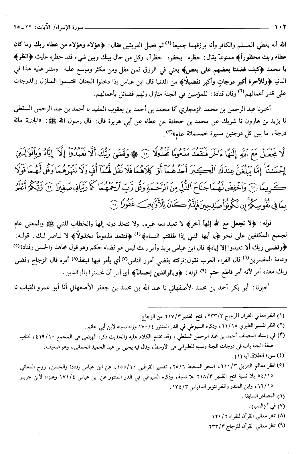 {لا تَجْعَلْ مَعَ اللَّهِ إِلَهًا آخَرَ فَتَقْعُدَ مَذْمُومًا مَخْذُولا {22} وَقَضَى رَبُّكَ أَلَّا تَعْبُدُوا إِلا إِيَّاهُ وَبِالْوَالِدَيْنِ إِحْسَانًا إِمَّا يَبْلُغَنَّ عِنْدَكَ الْكِبَرَ أَحَدُهُمَا أَوْ كِلاهُمَا فَلا تَقُلْ لَهُمَا أُفٍّ وَلا تَنْهَرْهُمَا وَقُلْ لَهُمَا قَوْلا كَرِيمًا {23} وَاخْفِضْ لَهُمَا جَنَاحَ الذُّلِّ مِنَ الرَّحْمَةِ وَقُلْ رَبِّ ارْحَمْهُمَا كَمَا رَبَّيَانِي صَغِيرًا {24} رَبُّكُمْ أَعْلَمُ بِمَا فِي نُفُوسِكُمْ إِنْ تَكُونُوا صَالِحِينَ فَإِنَّهُ كَانَ لِلأَوَّابِينَ غَفُورًا {25} } [الإسراء: 22-25] قوله: {لا تَجْعَلْ مَعَ اللَّهِ إِلَهًا آخَرَ} [الإسراء: 22] لا تعبد معه غيره، ولا تتخذ دونه إلها، والخطاب للنبي صَلَّى اللهُ عَلَيْهِ وَسَلَّمَ، والمعنى عام لجميع المكلفين على نحو {يَأَيُّهَا النَّبِيُّ إِذَا طَلَّقْتُمُ النِّسَاءَ} [الطلاق: 1] ، {فَتَقْعُدَ مَذْمُومًا مَخْذُولا} [الإسراء: 22] لا ناصر لك.