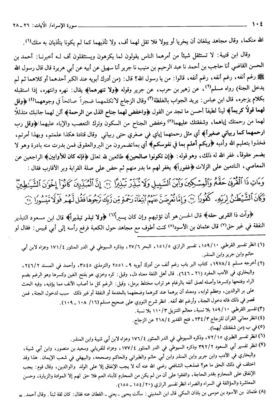 ثم حض على صلة القرابة وبر الأقارب، فقال: {وَآتِ ذَا الْقُرْبَى حَقَّهُ وَالْمِسْكِينَ وَابْنَ السَّبِيلِ وَلا تُبَذِّرْ تَبْذِيرًا {26} إِنَّ الْمُبَذِّرِينَ كَانُوا إِخْوَانَ الشَّيَاطِينِ وَكَانَ الشَّيْطَانُ لِرَبِّهِ كَفُورًا {27} وَإِمَّا تُعْرِضَنَّ عَنْهُمُ ابْتِغَاءَ رَحْمَةٍ مِنْ رَبِّكَ تَرْجُوهَا فَقُلْ لَهُمْ قَوْلا مَيْسُورًا {28} } [الإسراء: 26-28] {وَآتِ ذَا الْقُرْبَى حَقَّهُ} [الإسراء: 26] قال الحسن: هو أن تؤتيهم وإن كان يسيرا.