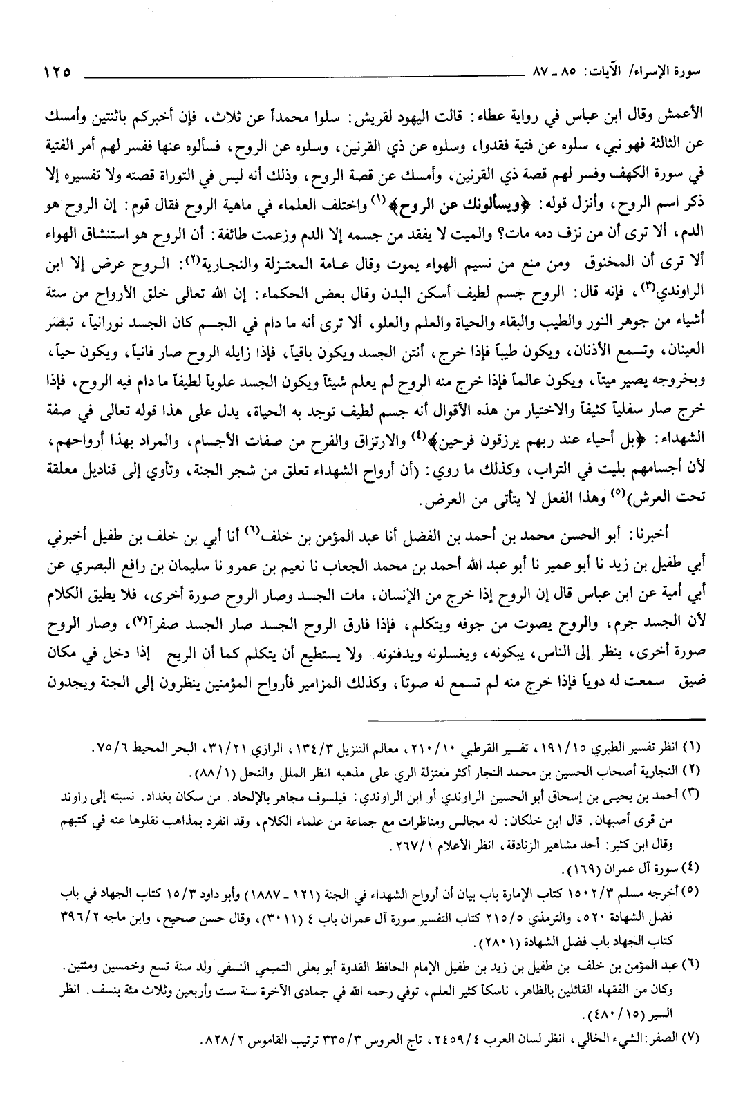 واختلف العلماء فِي ماهية الروح، فقال قوم: إن الروح هو الدم، ألا ترى أن من نزف دمه مات؟ والميت لا يفقد من جسمه إلا الدم.
