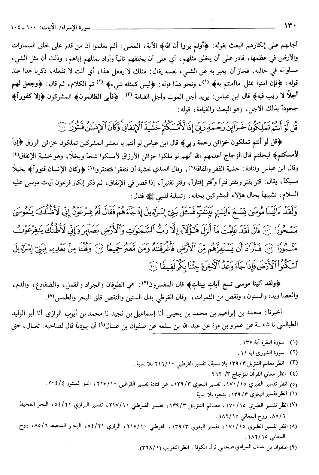 ثم ذكر إنكار فرعون آيات موسى عليه السلام، تشبيها بحال هؤلاء المشركين بحاله، وتسلية للنبي صَلَّى اللهُ عَلَيْهِ وَسَلَّمَ، فقال: {وَلَقَدْ آتَيْنَا مُوسَى تِسْعَ آيَاتٍ بَيِّنَاتٍ فَاسْأَلْ بَنِي إِسْرَائِيلَ إِذْ جَاءَهُمْ فَقَالَ لَهُ فِرْعَوْنُ إِنِّي لأَظُنُّكَ يَا مُوسَى مَسْحُورًا {101} قَالَ لَقَدْ عَلِمْتَ مَا أَنْزَلَ هَؤُلاءِ إِلا رَبُّ السَّمَوَاتِ وَالأَرْضِ بَصَائِرَ وَإِنِّي لأَظُنُّكَ يَا فِرْعَوْنُ مَثْبُورًا {102} فَأَرَادَ أَنْ يَسْتَفِزَّهُمْ مِنَ الأَرْضِ فَأَغْرَقْنَاهُ وَمَنْ مَعَهُ جَمِيعًا {103} وَقُلْنَا مِنْ بَعْدِهِ لِبَنِي إِسْرَائِيلَ اسْكُنُوا الأَرْضَ فَإِذَا جَاءَ وَعْدُ الآخِرَةِ جِئْنَا بِكُمْ لَفِيفًا {104} } [الإسراء: 101-104] {وَلَقَدْ آتَيْنَا مُوسَى تِسْعَ آيَاتٍ بَيِّنَاتٍ} [الإسراء: 101] قال المفسرون: هي الطوفان والجراد والقمل، والضفادع والدم، والعصا، ويده والسنون، ونقص من الثمرات.