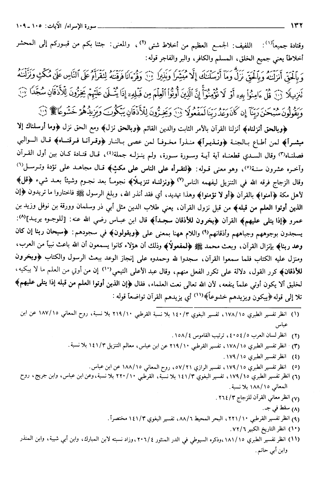 قوله: {وَبِالْحَقِّ أَنْزَلْنَاهُ وَبِالْحَقِّ نَزَلَ وَمَا أَرْسَلْنَاكَ إِلا مُبَشِّرًا وَنَذِيرًا {105} وَقُرْءَانًا فَرَقْنَاهُ لِتَقْرَأَهُ عَلَى النَّاسِ عَلَى مُكْثٍ وَنَزَّلْنَاهُ تَنْزِيلا {106} قُلْ آمِنُوا بِهِ أَوْ لا تُؤْمِنُوا إِنَّ الَّذِينَ أُوتُوا الْعِلْمَ مِنْ قَبْلِهِ إِذَا يُتْلَى عَلَيْهِمْ يَخِرُّونَ لِلأَذْقَانِ سُجَّدًا {107} وَيَقُولُونَ سُبْحَانَ رَبِّنَا إِنْ كَانَ وَعْدُ رَبِّنَا لَمَفْعُولا {108} وَيَخِرُّونَ لِلأَذْقَانِ يَبْكُونَ وَيَزِيدُهُمْ خُشُوعًا {109} } [الإسراء: 105-109] {وَبِالْحَقِّ أَنْزَلْنَاهُ} [الإسراء: 105] أنزلنا القرآن بالأمر الثابت والدين القائم، {وَبِالْحَقِّ نَزَلَ} [الإسراء: 105] ومع الحق نزل، {وَمَا أَرْسَلْنَاكَ إِلا مُبَشِّرًا} [الإسراء: 105] لمن أطاع بالجنة، {وَنَذِيرًا} [الإسراء: 105] منذرا مخوفا لمن عصى بالنار.