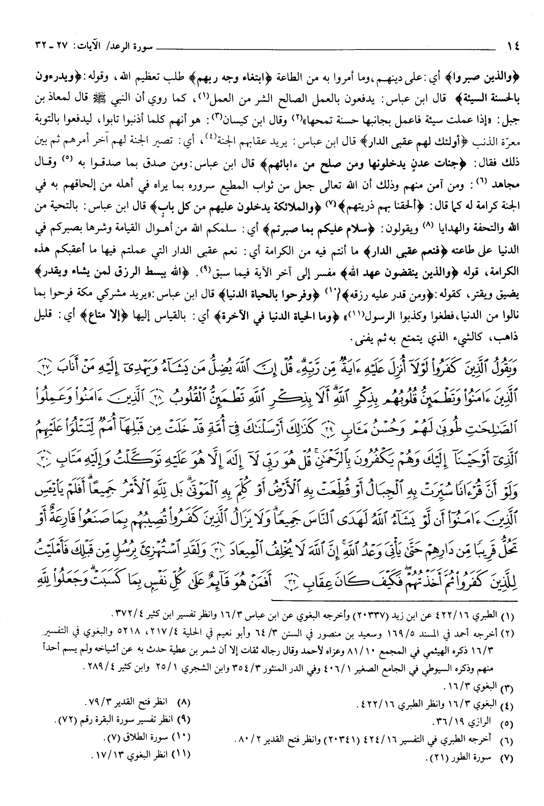 {وَيَقُولُ الَّذِينَ كَفَرُوا لَوْلا أُنْزِلَ عَلَيْهِ آيَةٌ مِنْ رَبِّهِ قُلْ إِنَّ اللَّهَ يُضِلُّ مَنْ يَشَاءُ وَيَهْدِي إِلَيْهِ مَنْ أَنَابَ {27} الَّذِينَ آمَنُوا وَتَطْمَئِنُّ قُلُوبُهُمْ بِذِكْرِ اللَّهِ أَلا بِذِكْرِ اللَّهِ تَطْمَئِنُّ الْقُلُوبُ {28} الَّذِينَ آمَنُوا وَعَمِلُوا الصَّالِحَاتِ طُوبَى لَهُمْ وَحُسْنُ مَآبٍ {29} كَذَلِكَ أَرْسَلْنَاكَ فِي أُمَّةٍ قَدْ خَلَتْ مِنْ قَبْلِهَا أُمَمٌ لِتَتْلُوَ عَلَيْهِمُ الَّذِي أَوْحَيْنَا إِلَيْكَ وَهُمْ يَكْفُرُونَ بِالرَّحْمَنِ قُلْ هُوَ رَبِّي لا إِلَهَ إِلا هُوَ عَلَيْهِ تَوَكَّلْتُ وَإِلَيْهِ مَتَابِ {30} وَلَوْ أَنَّ قُرْءَانًا سُيِّرَتْ بِهِ الْجِبَالُ أَوْ قُطِّعَتْ بِهِ الأَرْضُ أَوْ كُلِّمَ بِهِ الْمَوْتَى بَلْ لِلَّهِ الأَمْرُ جَمِيعًا أَفَلَمْ يَيْئَسِ الَّذِينَ آمَنُوا أَنْ لَوْ يَشَاءُ اللَّهُ لَهَدَى النَّاسَ جَمِيعًا وَلا يَزَالُ الَّذِينَ كَفَرُوا تُصِيبُهُمْ بِمَا صَنَعُوا قَارِعَةٌ أَوْ تَحُلُّ قَرِيبًا مِنْ دَارِهِمْ حَتَّى يَأْتِيَ وَعْدُ اللَّهِ إِنَّ اللَّهَ لا يُخْلِفُ الْمِيعَادَ {31} وَلَقَدِ اسْتُهْزِئَ بِرُسُلٍ مِنْ قَبْلِكَ فَأَمْلَيْتُ لِلَّذِينَ كَفَرُوا ثُمَّ أَخَذْتُهُمْ فَكَيْفَ كَانَ عِقَابِ {32} أَفَمَنْ هُوَ قَائِمٌ عَلَى كُلِّ نَفْسٍ بِمَا كَسَبَتْ وَجَعَلُوا لِلَّهِ
