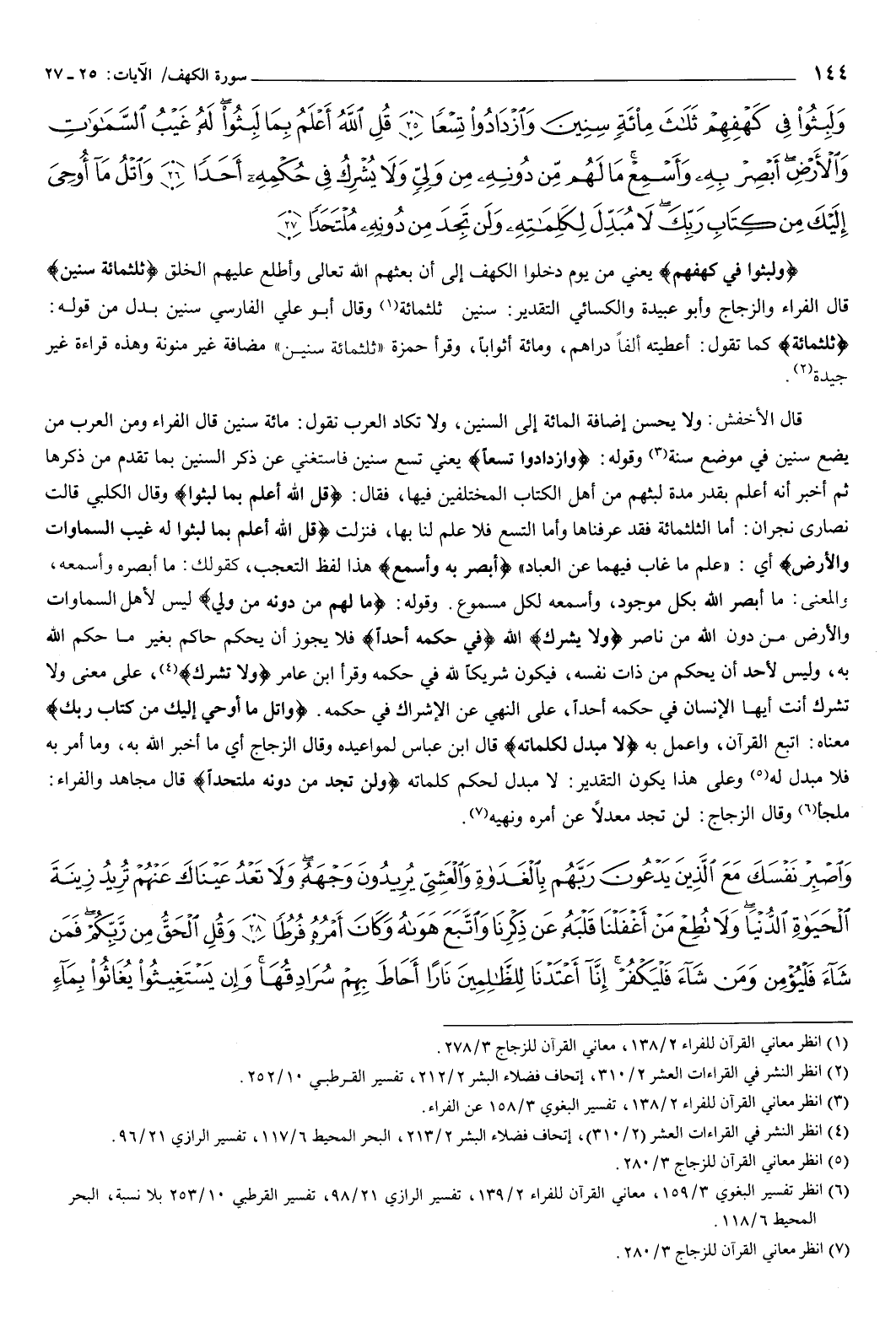 وَلَبِثُوا فِي كَهْفِهِمْ ثَلاثَ مِائَةٍ سِنِينَ وَازْدَادُوا تِسْعًا {25} قُلِ اللَّهُ أَعْلَمُ بِمَا لَبِثُوا لَهُ غَيْبُ السَّمَوَاتِ وَالأَرْضِ أَبْصِرْ بِهِ وَأَسْمِعْ مَا لَهُمْ مِنْ دُونِهِ مِنْ وَلِيٍّ وَلا يُشْرِكُ فِي حُكْمِهِ أَحَدًا {26} وَاتْلُ مَا أُوحِيَ إِلَيْكَ مِنْ كِتَابِ رَبِّكَ لا مُبَدِّلَ لِكَلِمَاتِهِ وَلَنْ تَجِدَ مِنْ دُونِهِ مُلْتَحَدًا {27} } [الكهف: 25-27] {وَلَبِثُوا فِي كَهْفِهِمْ} [الكهف: 25] يعني من يوم دخلوا الكهف إلى أن بعثهم الله تعالى، وأطلع عليهم الخلق، {ثَلاثَ مِائَةٍ سِنِينَ} [الكهف: 25] قال الفراء، والزجاج، وأبو عبيدة، والكسائي: التقدير سنين ثلاث مائة.