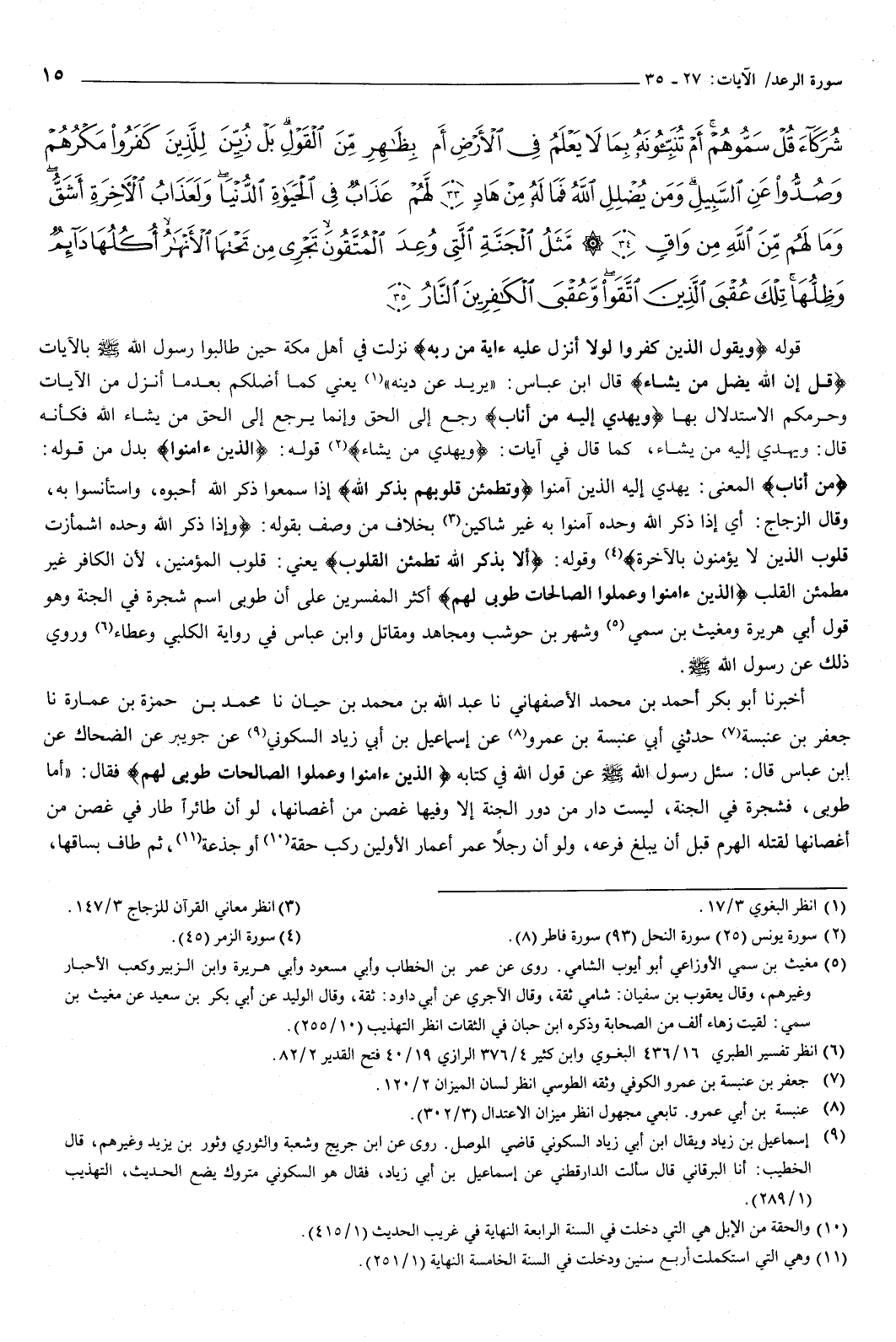 شُرَكَاءَ قُلْ سَمُّوهُمْ أَمْ تُنَبِّئُونَهُ بِمَا لا يَعْلَمُ فِي الأَرْضِ أَمْ بِظَاهِرٍ مِنَ الْقَوْلِ بَلْ زُيِّنَ لِلَّذِينَ كَفَرُوا مَكْرُهُمْ وَصُدُّوا عَنِ السَّبِيلِ وَمَنْ يُضْلِلِ اللَّهُ فَمَا لَهُ مِنْ هَادٍ {33} لَهُمْ عَذَابٌ فِي الْحَيَاةِ الدُّنْيَا وَلَعَذَابُ الآخِرَةِ أَشَقُّ وَمَا لَهُمْ مِنَ اللَّهِ مِنْ وَاقٍ {34} مَثَلُ الْجَنَّةِ الَّتِي وُعِدَ الْمُتَّقُونَ تَجْرِي مِنْ تَحْتِهَا الأَنْهَارُ أُكُلُهَا دَائِمٌ وَظِلُّهَا تِلْكَ عُقْبَى الَّذِينَ اتَّقَوْا وَعُقْبَى الْكَافِرِينَ النَّارُ {35} } [الرعد: 27-35] قوله: {وَيَقُولُ الَّذِينَ كَفَرُوا لَوْلا أُنْزِلَ عَلَيْهِ آيَةٌ مِنْ رَبِّهِ} [الرعد: 27] نزلت في أهل مكة حين طالبوا رسول الله صَلَّى اللهُ عَلَيْهِ وَسَلَّمَ بالآيات، {قُلْ إِنَّ اللَّهَ يُضِلُّ مَنْ يَشَاءُ} [الرعد: 27] قال ابن عباس: يريد عن دينه.