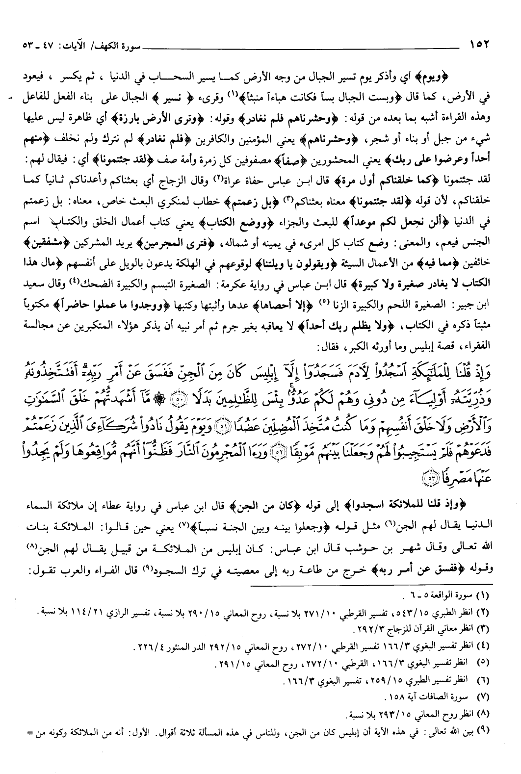 ويوم أي: وأذكر يوم تسير الجبال من وجه الأرض كما يسير السحاب فِي الدنيا، ثم يكسر، فيعود فِي الأرض، كما قال: {وَبُسَّتِ الْجِبَالُ بَسًّا {5} فَكَانَتْ هَبَاءً مُنْبَثًّا {6} } [الواقعة: 5-6] وقرئ نسير الجبال على بناء الفعل للفاعل، وهذه القراءة أشبه بما بعده من قوله: {وَحَشَرْنَاهُمْ فَلَمْ نُغَادِرْ} [الكهف: 47] ، وقوله: {وَتَرَى الأَرْضَ بَارِزَةً} [الكهف: 47] أي: ظاهرة ليس عليها شيء من جبل أو بناء أو شجر، وحشرناهم يعني المؤمنين والكافرين، فلم نغادر لم نترك ولم نخلف، {مِنْهُمْ أَحَدًا {47} وَعُرِضُوا عَلَى رَبِّكَ} [الكهف: 47-48] يعني المحشورين، صفا مصفوفين، كل زمرة وأمة صف، لقد جئتمونا أي: فيقال لهم: لقد جئتمونا، {كَمَا خَلَقْنَاكُمْ أَوَّلَ مَرَّةٍ} [الكهف: 48] قال ابن عباس: حفاة عراة.