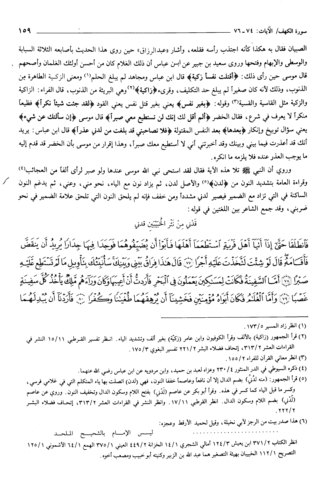 وقوله: {بِغَيْرِ نَفْسٍ} [الكهف: 74] يعني: بغير قتل نفس، يعني القود، {لَقَدْ جِئْتَ شَيْئًا نُكْرًا} [الكهف: 74] فظيعا منكرا، لا يعرف فِي شرع.