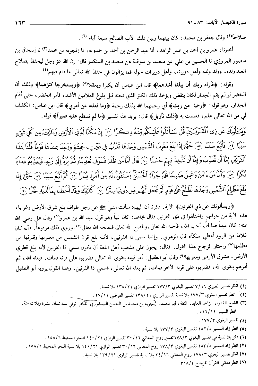 قوله: {وَيَسْأَلُونَكَ عَنْ ذِي الْقَرْنَيْنِ قُلْ سَأَتْلُو عَلَيْكُمْ مِنْهُ ذِكْرًا {83} إِنَّا مَكَّنَّا لَهُ فِي الأَرْضِ وَآتَيْنَاهُ مِنْ كُلِّ شَيْءٍ سَبَبًا {84} فَأَتْبَعَ سَبَبًا {85} حَتَّى إِذَا بَلَغَ مَغْرِبَ الشَّمْسِ وَجَدَهَا تَغْرُبُ فِي عَيْنٍ حَمِئَةٍ وَوَجَدَ عِنْدَهَا قَوْمًا قُلْنَا يَا ذَا الْقَرْنَيْنِ إِمَّا أَنْ تُعَذِّبَ وَإِمَّا أَنْ تَتَّخِذَ فِيهِمْ حُسْنًا {86} قَالَ أَمَّا مَنْ ظَلَمَ فَسَوْفَ نُعَذِّبُهُ ثُمَّ يُرَدُّ إِلَى رَبِّهِ فَيُعَذِّبُهُ عَذَابًا نُكْرًا {87} وَأَمَّا مَنْ آمَنَ وَعَمِلَ صَالِحًا فَلَهُ جَزَاءً الْحُسْنَى وَسَنَقُولُ لَهُ مِنْ أَمْرِنَا يُسْرًا {88} ثُمَّ أَتْبَعَ سَبَبًا {89} حَتَّى إِذَا بَلَغَ مَطْلِعَ الشَّمْسِ وَجَدَهَا تَطْلُعُ عَلَى قَوْمٍ لَمْ نَجْعَلْ لَهُمْ مِنْ دُونِهَا سِتْرًا {90} كَذَلِكَ وَقَدْ أَحَطْنَا بِمَا لَدَيْهِ خُبْرًا {91} } [الكهف: 83-91] {وَيَسْأَلُونَكَ عَنْ ذِي الْقَرْنَيْنِ} [الكهف: 83] الآية، ذكرنا أن اليهود سألت النبي صَلَّى اللهُ عَلَيْهِ وَسَلَّمَ عن رجل طواف، بلغ شرق الأرض وغربها، هذه الآية من جوابهم، واختلفوا فِي ذي القرنين، فقال: مجاهد: كان نبيا.