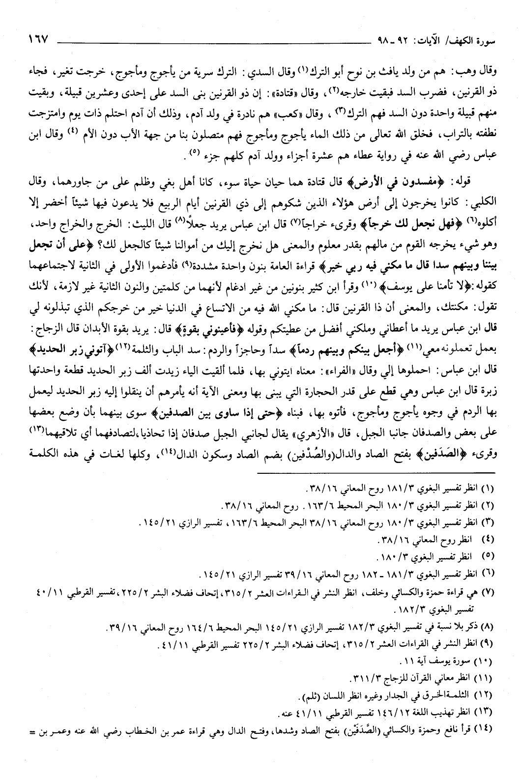 ومعنى الآية أنه يأمرهم أن ينقلوا إليه زبر الحديد ليعمل بها الردم فِي وجوه يأجوج ومأجوج، فأتوه بها، فبناه، {حَتَّى إِذَا سَاوَى بَيْنَ الصَّدَفَيْنِ} [الكهف: 96] سوى بينهما بأن وضع بعضها على بعض، والصدفان جانبا الجبل، قال الأزهري: يقال لجانبي الجبل صدفان إذا تحاذيا لتصادفهما، أي تلاقيهما.