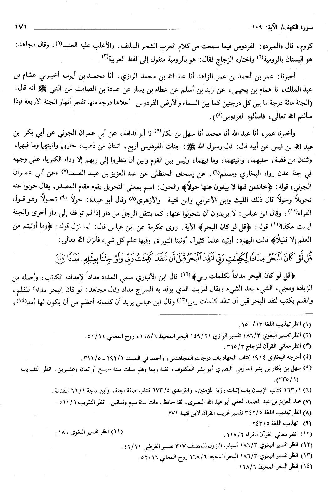 فأنزل الله تعالى: {قُلْ لَوْ كَانَ الْبَحْرُ مِدَادًا لِكَلِمَاتِ رَبِّي لَنَفِدَ الْبَحْرُ قَبْلَ أَنْ تَنْفَدَ كَلِمَاتُ رَبِّي وَلَوْ جِئْنَا بِمِثْلِهِ مَدَدًا} [الكهف: 109] .