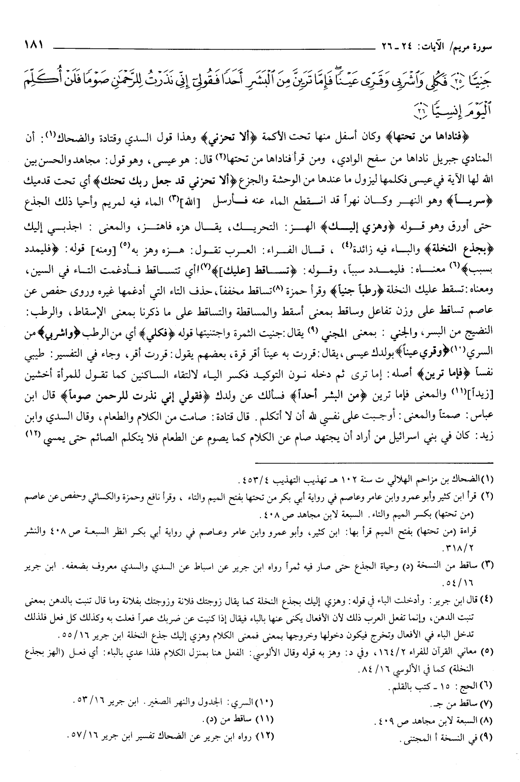 جَنِيًّا {25} فَكُلِي وَاشْرَبِي وَقَرِّي عَيْنًا فَإِمَّا تَرَيِنَّ مِنَ الْبَشَرِ أَحَدًا فَقُولِي إِنِّي نَذَرْتُ لِلرَّحْمَنِ صَوْمًا فَلَنْ أُكَلِّمَ الْيَوْمَ إِنْسِيًّا {26} } [مريم: 24-26] {فَنَادَاهَا مِنْ تَحْتِهَا} [مريم: 24] وكان أسفل منها تحت الأكمة، ألا تحزني وهذا قول السدي، وقتادة، والضحاك: أن المنادي جبريل، ناداها من سفح الوادي.