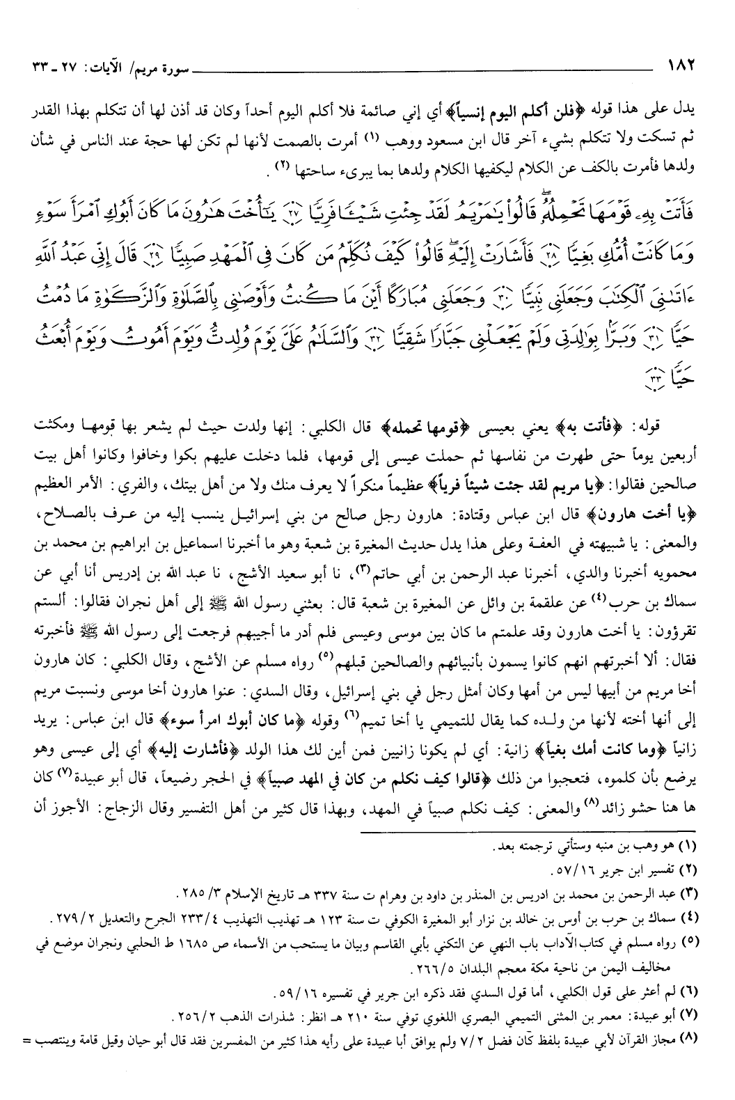 {فَأَتَتْ بِهِ قَوْمَهَا تَحْمِلُهُ قَالُوا يَا مَرْيَمُ لَقَدْ جِئْتِ شَيْئًا فَرِيًّا {27} يَا أُخْتَ هَارُونَ مَا كَانَ أَبُوكِ امْرَأَ سَوْءٍ وَمَا كَانَتْ أُمُّكِ بَغِيًّا {28} فَأَشَارَتْ إِلَيْهِ قَالُوا كَيْفَ نُكَلِّمُ مَنْ كَانَ فِي الْمَهْدِ صَبِيًّا {29} قَالَ إِنِّي عَبْدُ اللَّهِ آتَانِيَ الْكِتَابَ وَجَعَلَنِي نَبِيًّا {30} وَجَعَلَنِي مُبَارَكًا أَيْنَ مَا كُنْتُ وَأَوْصَانِي بِالصَّلاةِ وَالزَّكَاةِ مَا دُمْتُ حَيًّا {31} وَبَرًّا بِوَالِدَتِي وَلَمْ يَجْعَلْنِي جَبَّارًا شَقِيًّا {32} وَالسَّلامُ عَلَيَّ يَوْمَ وُلِدْتُ وَيَوْمَ أَمُوتُ وَيَوْمَ أُبْعَثُ حَيًّا {33} } [مريم: 27-33] قوله: {فَأَتَتْ بِهِ} [مريم: 27] يعني بعيسى، {قَوْمَهَا تَحْمِلُهُ} [مريم: 27] قال الكلبي: إنها ولدت حيث لم يشعر بها قومها، ومكثت أربعين يوما حتى طهرت من نفاسها، ثم حملت عيسى إلى قومها، فلما دخلت عليهم بكوا وخافوا، وكانوا أهل بيت صالحين، فقالوا: {يَا مَرْيَمُ لَقَدْ جِئْتِ شَيْئًا فَرِيًّا} [مريم: 27] عظيما منكرا، لا يعرف منك ولا من أهل بيتك، والفري الأمر العظيم.