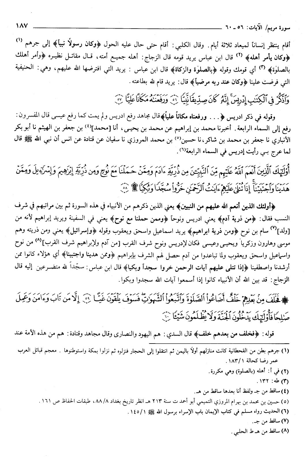 {أُولَئِكَ الَّذِينَ أَنْعَمَ اللَّهُ عَلَيْهِمْ مِنَ النَّبِيِّينَ مِنْ ذُرِّيَّةِ آدَمَ وَمِمَّنْ حَمَلْنَا مَعَ نُوحٍ وَمِنْ ذُرِّيَّةِ إِبْرَاهِيمَ وَإِسْرَائِيلَ وَمِمَّنْ هَدَيْنَا وَاجْتَبَيْنَا إِذَا تُتْلَى عَلَيْهِمْ آيَاتُ الرَّحْمَنِ خَرُّوا سُجَّدًا وَبُكِيًّا} [مريم: 58] {أُولَئِكَ الَّذِينَ أَنْعَمَ اللَّهُ عَلَيْهِمْ مِنَ النَّبِيِّينَ} [مريم: 58] يعني الذين ذكرهم من الأنبياء فِي هذه ال { [، ثم بين مراتبهم فِي شرف النسب، فقال:] مِنْ ذُرِّيَّةِ آدَمَ} [سورة مريم: 58] يعني: إدريس ونوحا، {وَمِمَّنْ حَمَلْنَا مَعَ نُوحٍ} [مريم: 58] يعني: فِي السفينة، ويريد إبراهيم، لأنه من ولد سام بن نوح، {وَمِنْ ذُرِّيَّةِ إِبْرَاهِيمَ} [مريم: 58] يريد إسماعيل وإسحاق ويعقوب، وقوله: وإسرائيل يعني: ومن ذريته، وهم: موسى، وهارون، وزكريا، ويحيى، وعيسى، فكان لإدريس ونوح شرف القرب من آدم، ولإبراهيم شرف القرب من نوح وإسماعيل وإسحاق ويعقوب، ولما تباعدوا من آدم حصل لهم الشرف بإبراهيم، {وَمِمَّنْ هَدَيْنَا وَاجْتَبَيْنَا} [مريم: 58] أي: هؤلاء كانوا ممن أرشدنا واصطفينا، {إِذَا تُتْلَى عَلَيْهِمْ آيَاتُ الرَّحْمَنِ خَرُّوا سُجَّدًا وَبُكِيًّا} [مريم: 58] قال ابن عباس: سجدا لله متضرعين إليه.