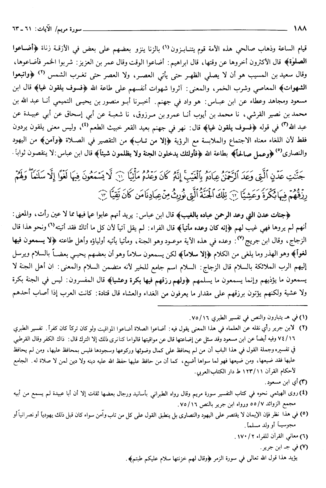 {جَنَّاتِ عَدْنٍ الَّتِي وَعَدَ الرَّحْمَنُ عِبَادَهُ بِالْغَيْبِ إِنَّهُ كَانَ وَعْدُهُ مَأْتِيًّا {61} لا يَسْمَعُونَ فِيهَا لَغْوًا إِلا سَلامًا وَلَهُمْ رِزْقُهُمْ فِيهَا بُكْرَةً وَعَشِيًّا {62} تِلْكَ الْجَنَّةُ الَّتِي نُورِثُ مِنْ عِبَادِنَا مَنْ كَانَ تَقِيًّا {63} } [مريم: 61-63] {جَنَّاتِ عَدْنٍ الَّتِي وَعَدَ الرَّحْمَنُ عِبَادَهُ بِالْغَيْبِ} [مريم: 61] قال ابن عباس: يريد أنهم عابوا عما فِيها مما لا عين رأت.