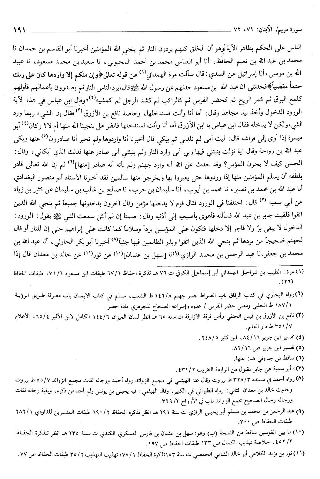 595 - أَخْبَرَنَا أَبُو الْقَاسِمِ بْنُ حَمْدَانَ، نا مُحَمَّدُ بْنُ عَبْدِ اللَّهِ بْنِ نُعَيْمٍ الْحَافِظُ، أنا أَبُو الْعَبَّاسِ مُحَمَّدُ بْنُ أَحْمَدَ الْمَحْبُوبِيُّ، نا سَعِيدُ بْنُ مَسْعُودٍ، نا عُبَيْدُ اللَّهِ بْنُ مُوسَى، أنا إِسْرَائِيلُ، عَنِ السُّدِّيِّ، قَالَ: سَأَلْتُ مُرَّةَ الْهَمْدَانِيَّ، عَنْ قَوْلِهِ، تَعَالَى: {وَإِنْ مِنْكُمْ إِلا وَارِدُهَا كَانَ عَلَى رَبِّكَ حَتْمًا مَقْضِيًّا} فَحَدَّثَنِي أَنَّ عَبْدَ اللَّهِ بْنَ مَسْعُودٍ حَدَّثَهُمْ، عَنْ رَسُولِ اللَّهِ، صَلَّى اللهُ عَلَيْهِ وَسَلَّمَ، قَالَ: «يَرِدُ النَّاسَ النَّارَ، ثُمَّ يَصْدُرُونَ بِأَعْمَالِهِمْ، فَأَوَّلُهُمْ كَلَمْحِ الْبَرْقِ، ثُمَّ كَمَرِّ الرِّيحِ، ثُمَّ كَحَضْرِ الْفَرَسِ، ثُمَّ كَالرَّاكِبِ، ثُمَّ كَشَدِّ الرَّجُلِ، ثُمَّ كَمَشْيِهِ» ، وَقَالَ ابْنُ عَبَّاسٍ فِي هَذِهِ الآيَةِ: الْوُرُودُ الدُّخُولُ، وَأَخَذَ بِيَدِ مُجَاهِدٍ، وَقَالَ: أَمَّا أَنَا وَأَنْتَ فَسَنَدْخُلُهَا، وَخَاصَّةً نَافِعُ بْنُ الأَزْرَقِ، فَقَالَ: إِنَّ الشَّيْءَ رُبَّمَا وَرَدَ الشَّيْءَ، وَلَكِنْ لا يَدْخُلُهُ، فَقَالَ ابْنُ عَبَّاسٍ: يَابْنَ الأَزْرَقِ، أَمَّا أَنَا وَأَنْتَ فَسَنَدْخُلُهَا، فَانْظُرْ هَلْ يُنْجِينَا اللَّهُ مِنْهَا أَمْ لا؟ وَكَانَ أَبُو مَيْسَرَةَ إِذَا أَوَى إِلَى فِرَاشِهِ؛ قَالَ: لَيْتَ أُمِّي لَمْ تَلِدْنِي، ثُمَّ يَبْكِي، قَالَ: أُخْبِرْنَا أَنَّا وَارِدُوهَا، وَلَمْ نُخْبَر أَنَّا صَادِرُونَ عَنْهَا، وَبَكَى عَبْدُ اللَّهِ بْنُ رَوَاحَةَ، وَقَالَ: آيَةٌ نَزَلَتْ يُنَبِّئُنِي فِيهَا رَبِّي أَنِّي وَارِدٌ النَّارَ وَلَمْ يُنَبِّئْنِي أَنِّي صَادِرٌ عَنْهَا، فَذَلِكَ الَّذِي أَبْكَانِي، وَقَالَ الْحَسَنُ: كَيْفَ لا يَحْزَنُ الْمُؤْمِنُ؟ وَقَدْ حَدَّثَ عَنِ اللَّهِ أَنَّهُ وَارِدٌ جَهَنَّمَ، وَلَمْ يَأْتِهِ أَنَّهُ صَادِرٌ مِنْهَا، ثُمَّ إِنَّ اللَّهَ، تَعَالَى، قَادِرٌ بِلُطْفِهِ أَنْ يُسَلِّمَ الْمُؤْمِنِينَ مِنْهَا إِذَا وَرَدُوهَا حَتَّى يَعْبُرُوا بِهَا وَيَخْرُجُوا مِنْهَا سَالِمِينَ