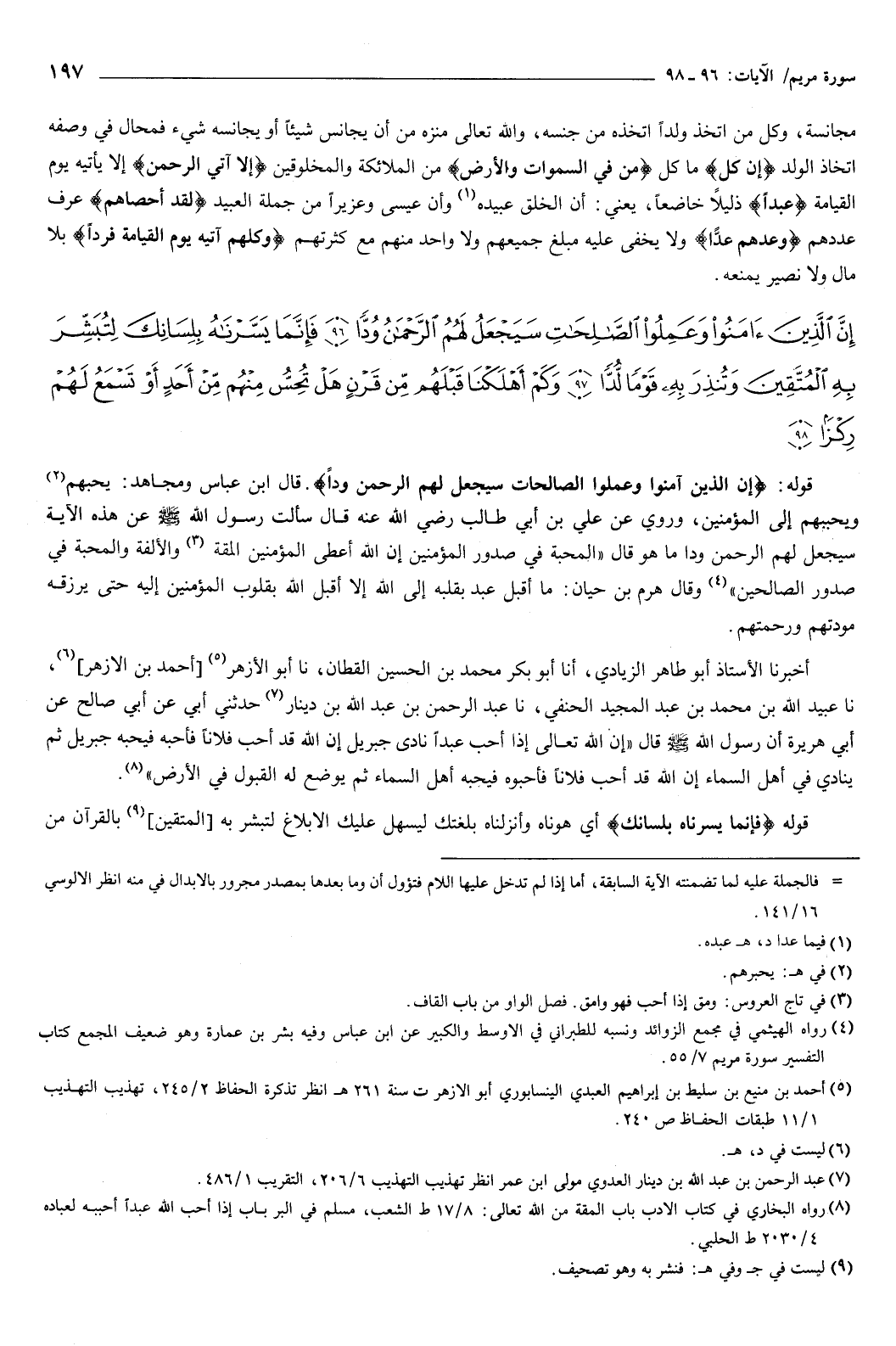 {إِنَّ الَّذِينَ آمَنُوا وَعَمِلُوا الصَّالِحَاتِ سَيَجْعَلُ لَهُمُ الرَّحْمَنُ وُدًّا {96} فَإِنَّمَا يَسَّرْنَاهُ بِلِسَانِكَ لِتُبَشِّرَ بِهِ الْمُتَّقِينَ وَتُنْذِرَ بِهِ قَوْمًا لُدًّا {97} وَكَمْ أَهْلَكْنَا قَبْلَهُمْ مِنْ قَرْنٍ هَلْ تُحِسُّ مِنْهُمْ مِنْ أَحَدٍ أَوْ تَسْمَعُ لَهُمْ رِكْزًا {98} } [مريم: 96-98] قوله: {إِنَّ الَّذِينَ آمَنُوا وَعَمِلُوا الصَّالِحَاتِ سَيَجْعَلُ لَهُمُ الرَّحْمَنُ وُدًّا} [مريم: 96] قال ابن عباس، ومجاهد: يحبهم ويحببهم إلى المؤمنين.