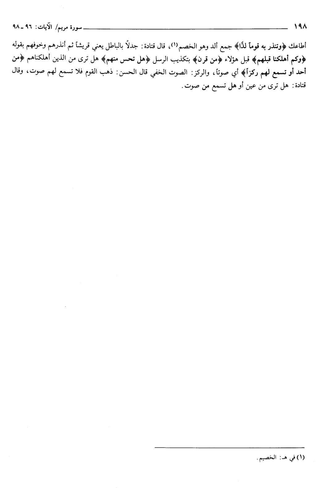 ثم أنذرهم وخوفهم بقوله: {وَكَمْ أَهْلَكْنَا قَبْلَهُمْ} [مريم: 98] قبل هؤلاء، من قرن بتكذيب الرسل، {هَلْ تُحِسُّ مِنْهُمْ} [مريم: 98] هل ترى من الذين أهلكناهم، {مِنْ أَحَدٍ أَوْ تَسْمَعُ لَهُمْ رِكْزًا} [مريم: 98] أي: صوتا، والركز الصوت الخفي، قال الحسن: ذهب القوم فلا تسمع لهم صوت.