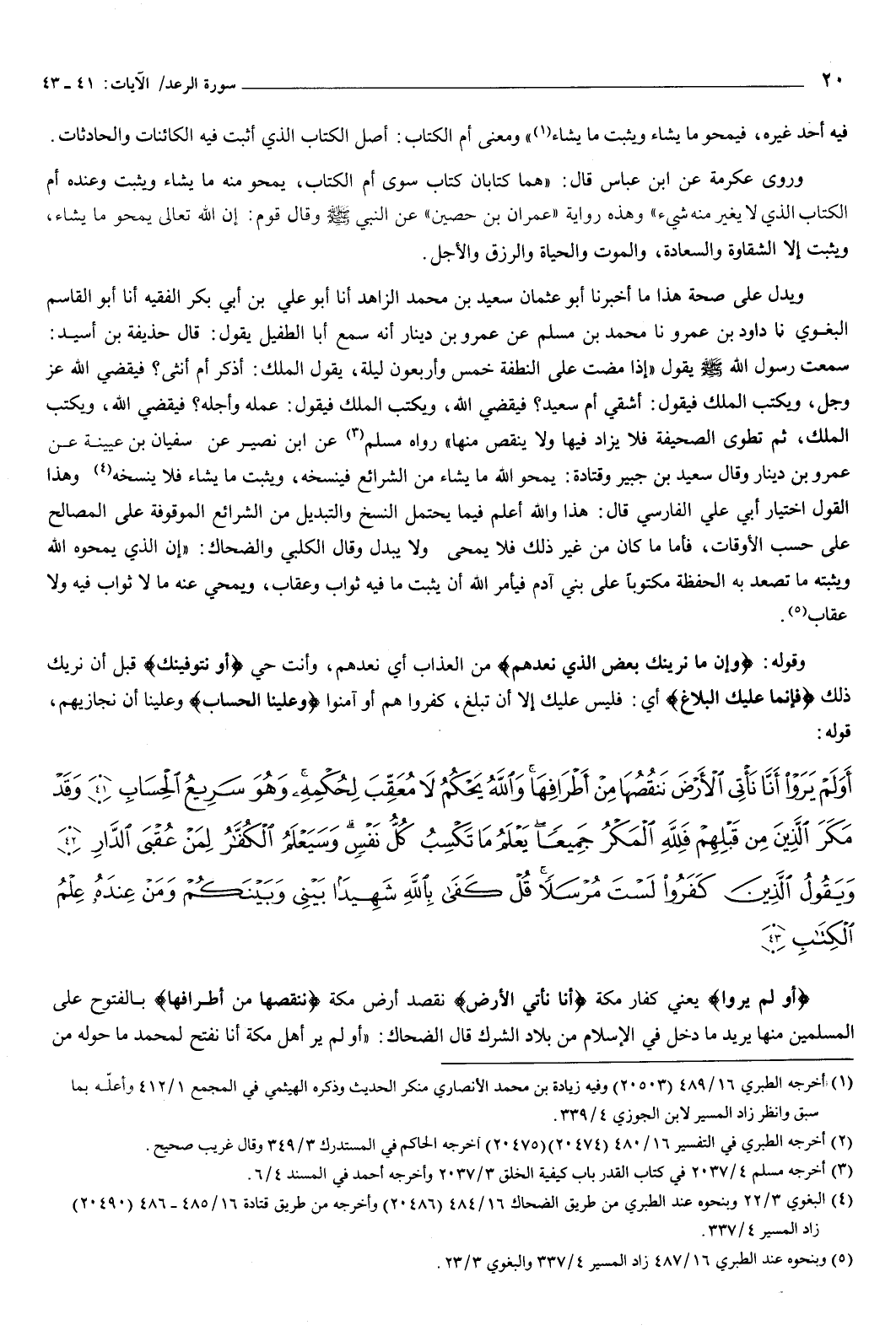 قوله: {أَوَلَمْ يَرَوْا أَنَّا نَأْتِي الأَرْضَ نَنْقُصُهَا مِنْ أَطْرَافِهَا وَاللَّهُ يَحْكُمُ لا مُعَقِّبَ لِحُكْمِهِ وَهُوَ سَرِيعُ الْحِسَابِ {41} وَقَدْ مَكَرَ الَّذِينَ مِنْ قَبْلِهِمْ فَلِلَّهِ الْمَكْرُ جَمِيعًا يَعْلَمُ مَا تَكْسِبُ كُلُّ نَفْسٍ وَسَيَعْلَمُ الْكُفَّارُ لِمَنْ عُقْبَى الدَّارِ {42} وَيَقُولُ الَّذِينَ كَفَرُوا لَسْتَ مُرْسَلا قُلْ كَفَى بِاللَّهِ شَهِيدًا بَيْنِي وَبَيْنَكُمْ وَمَنْ عِنْدَهُ عِلْمُ الْكِتَابِ {43} } [الرعد: 41-43] أولم يروا يعني كفار مكة، {أَنَّا نَأْتِي الأَرْضَ} [الرعد: 41] نقصد أرض مكة، {نَنْقُصُهَا مِنْ أَطْرَافِهَا} [الرعد: 41] بالفتوح على المسلمين منها، يريد ما دخل في الإسلام من بلاد الشرك، قال الضحاك: أو لم ير أهل مكة أنا نفتح لمحمد ما حوله من