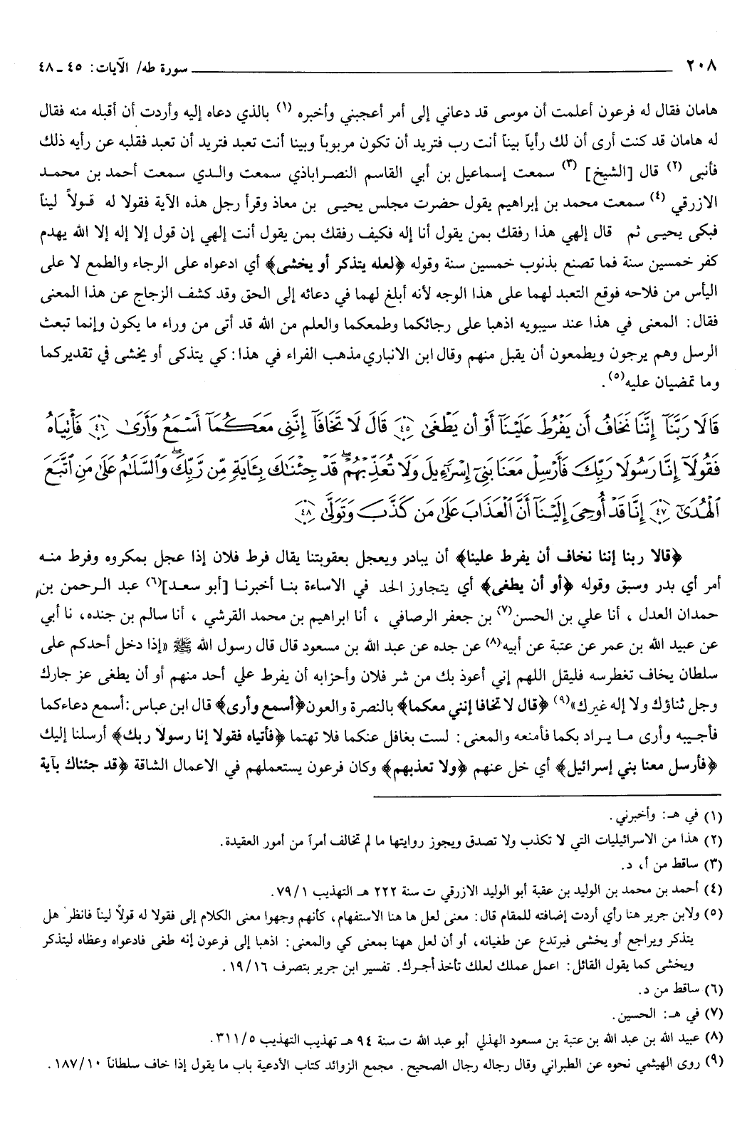 {قَالا رَبَّنَا إِنَّنَا نَخَافُ أَنْ يَفْرُطَ عَلَيْنَا أَوْ أَنْ يَطْغَى {45} قَالَ لا تَخَافَا إِنَّنِي مَعَكُمَا أَسْمَعُ وَأَرَى {46} فَأْتِيَاهُ فَقُولا إِنَّا رَسُولا رَبِّكَ فَأَرْسِلْ مَعَنَا بَنِي إِسْرَائِيلَ وَلا تُعَذِّبْهُمْ قَدْ جِئْنَاكَ بِآيَةٍ مِنْ رَبِّكَ وَالسَّلامُ عَلَى مَنِ اتَّبَعَ الْهُدَى {47} إِنَّا قَدْ أُوحِيَ إِلَيْنَا أَنَّ الْعَذَابَ عَلَى مَنْ كَذَّبَ وَتَوَلَّى {48} } [طه: 45-48] {قَالا رَبَّنَا إِنَّنَا نَخَافُ أَنْ يَفْرُطَ عَلَيْنَا} [طه: 45] أن يبادر ويعجل بعقوبتنا، يقال: فرط فلان إذا عجل بمكروه، وفرط منه أمر، أي بدر وسبق.