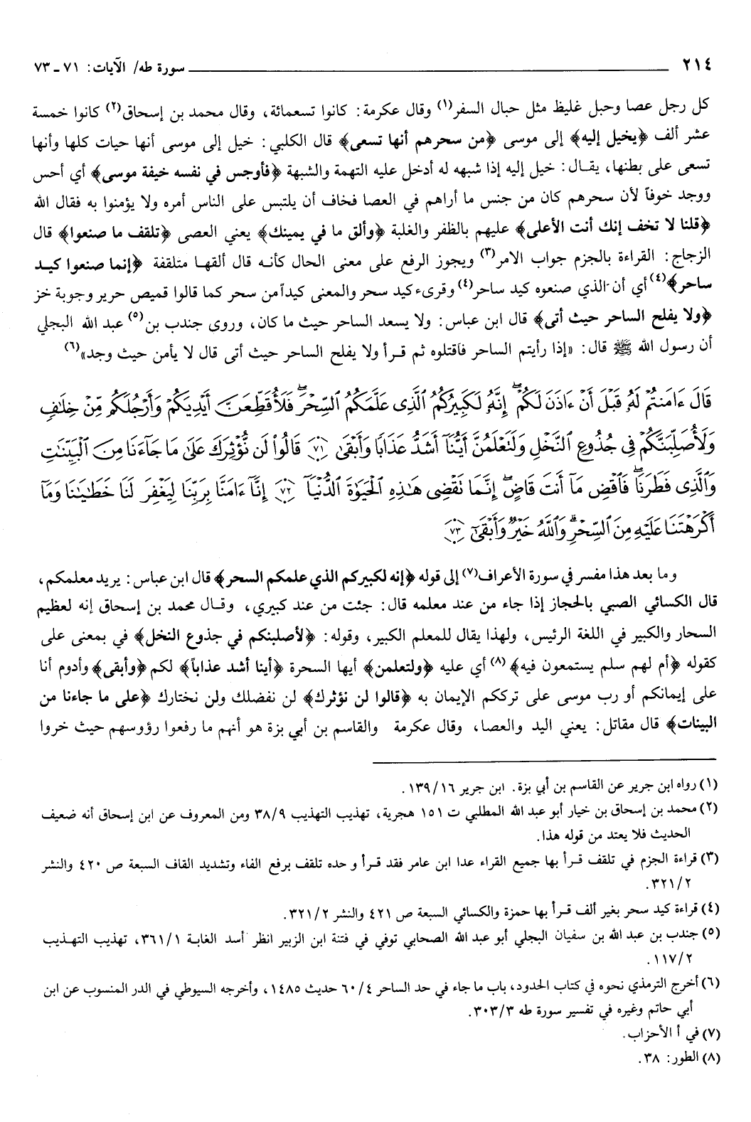 {قَالَ آمَنْتُمْ لَهُ قَبْلَ أَنْ آذَنَ لَكُمْ إِنَّهُ لَكَبِيرُكُمُ الَّذِي عَلَّمَكُمُ السِّحْرَ فَلأُقَطِّعَنَّ أَيْدِيَكُمْ وَأَرْجُلَكُمْ مِنْ خِلافٍ وَلأُصَلِّبَنَّكُمْ فِي جُذُوعِ النَّخْلِ وَلَتَعْلَمُنَّ أَيُّنَا أَشَدُّ عَذَابًا وَأَبْقَى {71} قَالُوا لَنْ نُؤْثِرَكَ عَلَى مَا جَاءَنَا مِنَ الْبَيِّنَاتِ وَالَّذِي فَطَرَنَا فَاقْضِ مَا أَنْتَ قَاضٍ إِنَّمَا تَقْضِي هَذِهِ الْحَيَاةَ الدُّنْيَا {72} إِنَّا آمَنَّا بِرَبِّنَا لِيَغْفِرَ لَنَا خَطَايَانَا وَمَا أَكْرَهْتَنَا عَلَيْهِ مِنَ السِّحْرِ وَاللَّهُ خَيْرٌ وَأَبْقَى {73} } [طه: 71-73] وما بعد هذا مفسر فِي { [الأعراف إلى قوله:] إِنَّهُ لَكَبِيرُكُمُ الَّذِي عَلَّمَكُمُ السِّحْرَ} [سورة طه: 71] قال ابن عباس: يريد معلمكم.