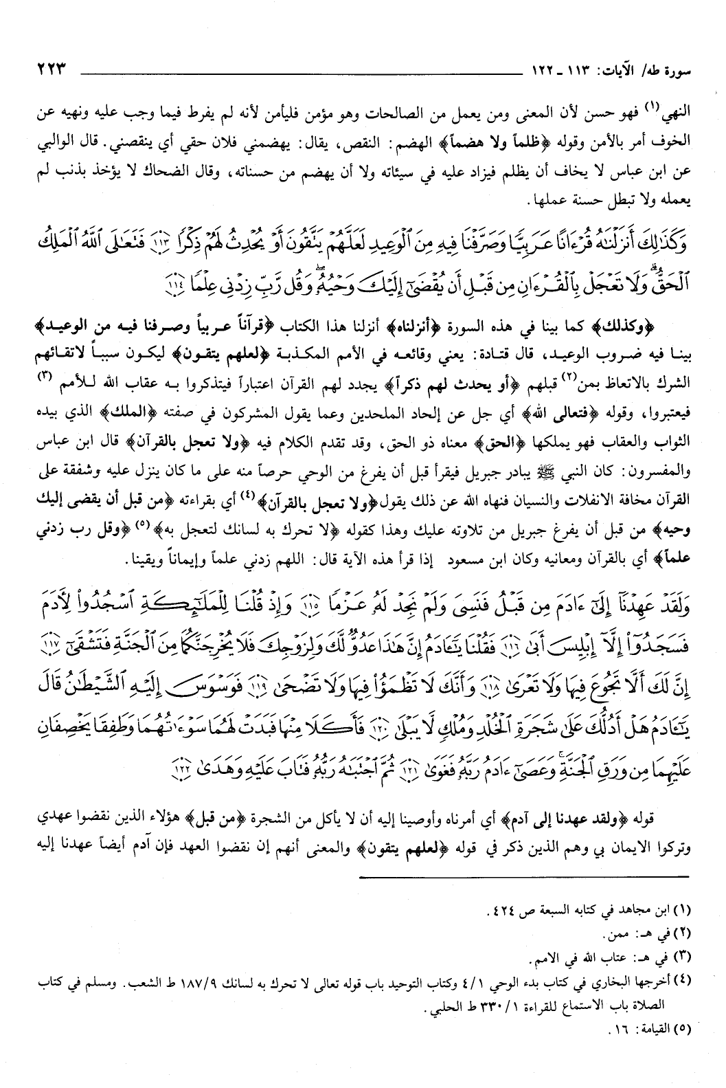 {وَكَذَلِكَ أَنْزَلْنَاهُ قُرْءَانًا عَرَبِيًّا وَصَرَّفْنَا فِيهِ مِنَ الْوَعِيدِ لَعَلَّهُمْ يَتَّقُونَ أَوْ يُحْدِثُ لَهُمْ ذِكْرًا {113} فَتَعَالَى اللَّهُ الْمَلِكُ الْحَقُّ وَلا تَعْجَلْ بِالْقُرْءَانِ مِنْ قَبْلِ أَنْ يُقْضَى إِلَيْكَ وَحْيُهُ وَقُلْ رَبِّ زِدْنِي عِلْمًا {114} } [طه: 113-114] وَكَذَلِكَ كما بينا فِي هذه ال { [، أنزلناه أنزلنا هذا الكتاب،] قُرْءَانًا عَرَبِيًّا وَصَرَّفْنَا فِيهِ مِنَ الْوَعِيدِ} [سورة طه: 113] بينا فيه ضروب الوعيد، قال قتادة: يعني وقائعه فِي الأمم المكذبة.
