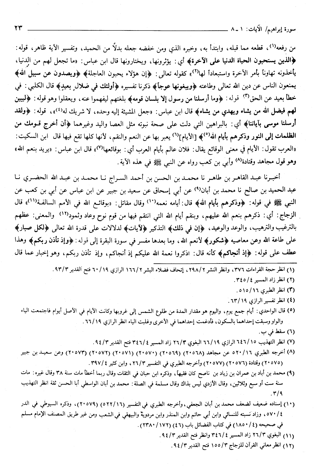 496 - أَخْبَرَنَا عَبْدُ الْقَاهِرِ بْنُ طَاهِرٍ، نا مُحَمَّدُ بْنُ الْحَسَنِ بْنِ أَحْمَدَ السَّرَّاجُ، نا مُحَمَّدُ بْنُ عَبْدِ اللَّهِ الْحَضرِيُّ، نا عَبْدُ الْحَمِيدِ بْنُ صَالِحٍ، نا مُحَمَّدُ بْنُ أَبَانٍ، عَنْ أَبِي إِسْحَاقَ، عَنْ سَعِيدِ بْنِ جُبَيْرٍ، عَنِ ابْنِ عَبَّاسٍ، عَنْ أُبَيِّ بْنِ كَعْبٍ، عَنِ النَّبِيِّ، صَلَّى اللهُ عَلَيْهِ وَسَلَّمَ، فِي قَوْلِهِ: {وَذَكِّرْهُمْ بِأَيَّامِ اللَّهِ} [إبراهيم: 5] ، قَالَ: أَيَّامُهُ: نُعَمُهُ