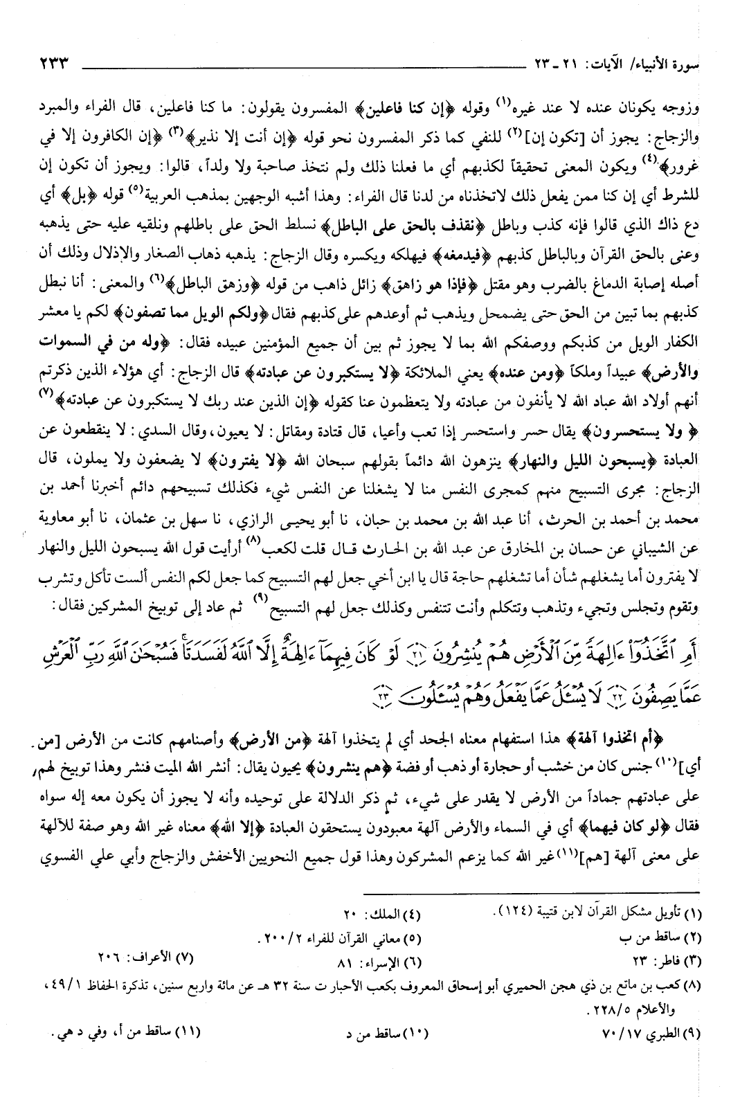 ثم عاد إلى توبيخ المشركين، فقال: {أَمِ اتَّخَذُوا آلِهَةً مِنَ الأَرْضِ هُمْ يُنْشِرُونَ {21} لَوْ كَانَ فِيهِمَا آلِهَةٌ إِلا اللَّهُ لَفَسَدَتَا فَسُبْحَانَ اللَّهِ رَبِّ الْعَرْشِ عَمَّا يَصِفُونَ {22} لا يُسْأَلُ عَمَّا يَفْعَلُ وَهُمْ يُسْأَلُونَ {23} } [الأنبياء: 21-23] {أَمِ اتَّخَذُوا آلِهَةً} [الأنبياء: 21] هذا استفهام معناه الجحد، أي لم يتخذوا آلهة، من الأرض وأصنامهم كانت من الأرض، من أيِّ جنس كان، من خشب، أو حجارة، أو ذهب، أو فضة.