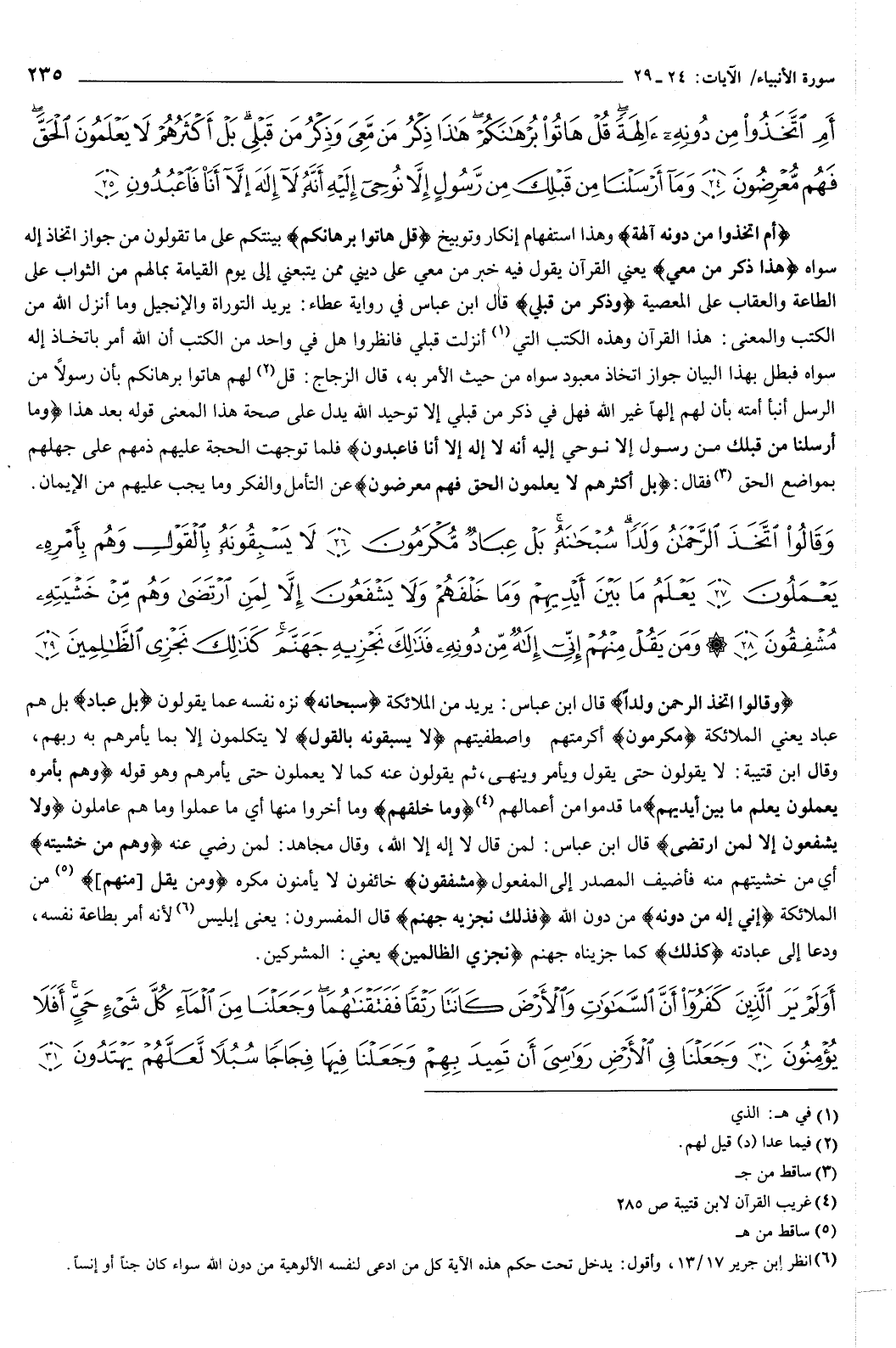 أَمِ اتَّخَذُوا مِنْ دُونِهِ آلِهَةً قُلْ هَاتُوا بُرْهَانَكُمْ هَذَا ذِكْرُ مَنْ مَعِيَ وَذِكْرُ مَنْ قَبْلِي بَلْ أَكْثَرُهُمْ لا يَعْلَمُونَ الْحَقَّ فَهُمْ مُعْرِضُونَ {24} وَمَا أَرْسَلْنَا مِنْ قَبْلِكَ مِنْ رَسُولٍ إِلا نُوحِي إِلَيْهِ أَنَّهُ لا إِلَهَ إِلا أَنَا فَاعْبُدُونِ {25} } [الأنبياء: 24-25] {أَمِ اتَّخَذُوا مِنْ دُونِهِ آلِهَةً} [الأنبياء: 24] وهذا استفهام إنكار وتوبيخ، {قُلْ هَاتُوا بُرْهَانَكُمْ} [الأنبياء: 24] بينتكم على ما تقولون من جواز اتخاذ إله سواه، {هَذَا ذِكْرُ مَنْ مَعِيَ} [الأنبياء: 24] يعني القرآن، يقول فيه خبر من معي على ديني ممن يتبعني إلى يوم القيامة بمالهم من الثواب على الطاعة والعقاب على المعصية، {وَذِكْرُ مَنْ قَبْلِي} [الأنبياء: 24] قال ابن عباس في رواية عطاء: يريد التوراة والإنجيل وما أنزل الله من الكتب.